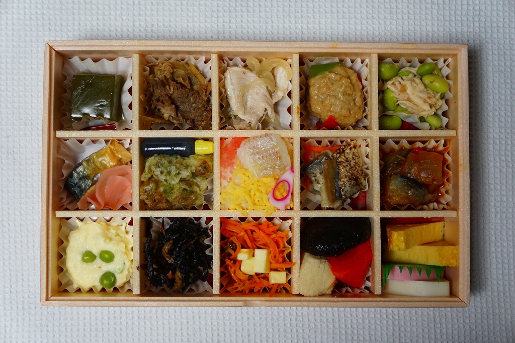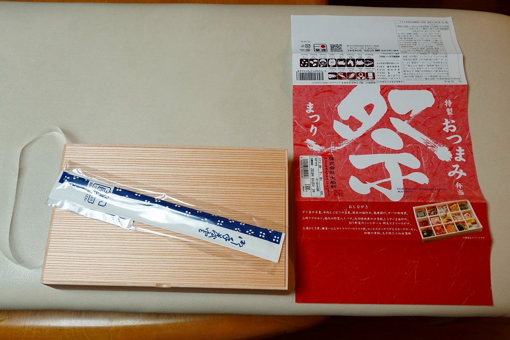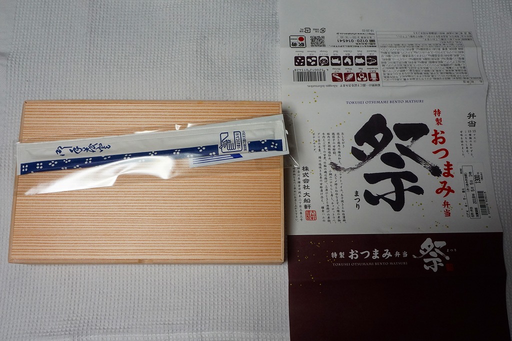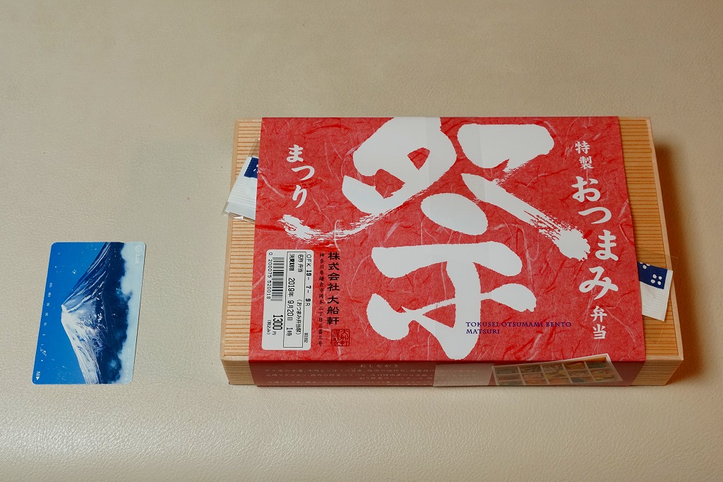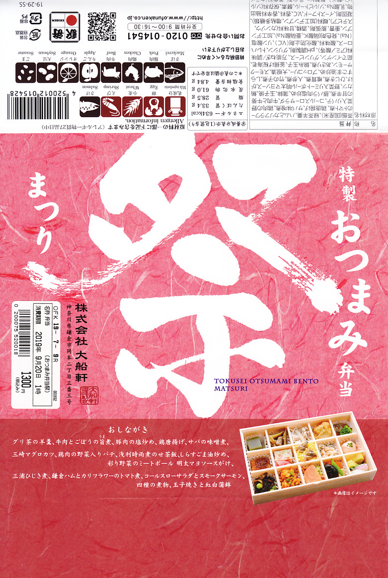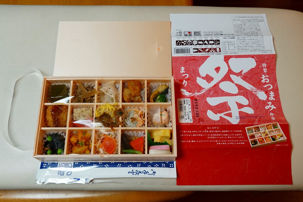 下記の駅弁「特選おつまみ弁当祭」を、2019(令和元)年9月に買ったもの。名前と値段と容器は同じで、掛紙が赤くなり、中身の半分弱が入れ替わっていた。掛紙の上面から側面へ移動したおしながきを転記すると、「グリ茶の羊羹」「牛肉とごぼうの旨煮」「豚肉の塩炒め」「鶏唐揚げ」「サバの味噌煮」「三崎マグロカツ」、「鶏肉の野菜入りパテ」「浅利時雨煮のせ茶飯」「しらすごま油炒め」「彩り野菜のミートボール明太マヨソースがけ」「三浦ひじき煮」「鎌倉ハムとカリフラワーのトマト煮」「コールスローサラダとスモークサーモン」「四種の煮物」「玉子焼きと紅白蒲鉾」で15区画。JR東日本グループ会社の事業再編という不思議な理由により、2021年3月限りで終売。
