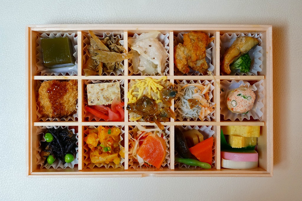 15区画に「枝豆と鶏肉の梅肉和え」「ラタトゥイユ」「玉子焼きと紅白蒲鉾」「鶏団子の甘酢餡」「炙り〆鯖と紅白なます」「三種の煮物」「豚肉の黒胡椒塩炒め」「小鯛の一口ちらし寿し」「キャロットラベ」「牛肉とごぼうの甘煮」「竹輪の磯辺揚げ」「三浦ひじきと油揚げの煮物」「グリ茶の羊羹」「鯖の塩焼き生姜の甘酢漬け添え」「鎌倉ハムのポテトサラダ」で、13種類のおかずとミニちらし寿司と甘味を詰めたと、掛紙に書いてある。この売店で人気になった青森駅弁「ひとくちだらけ」を、都会のセンスで作ったらこうなった感じの、名前どおりのおつまみ弁当。