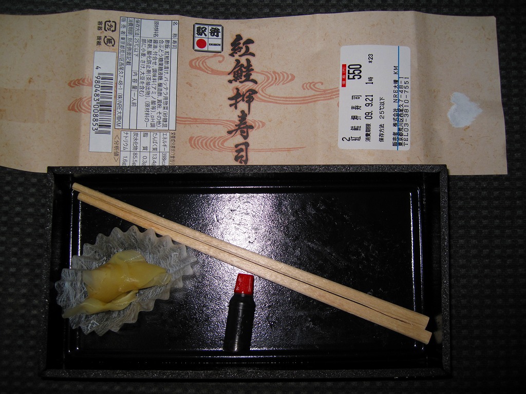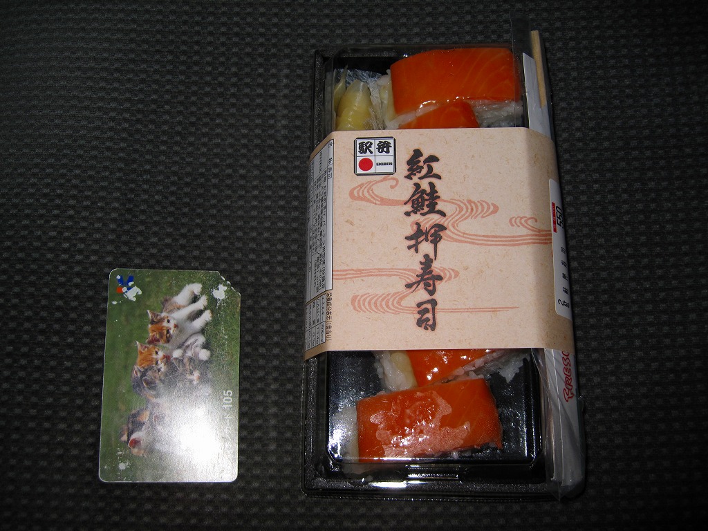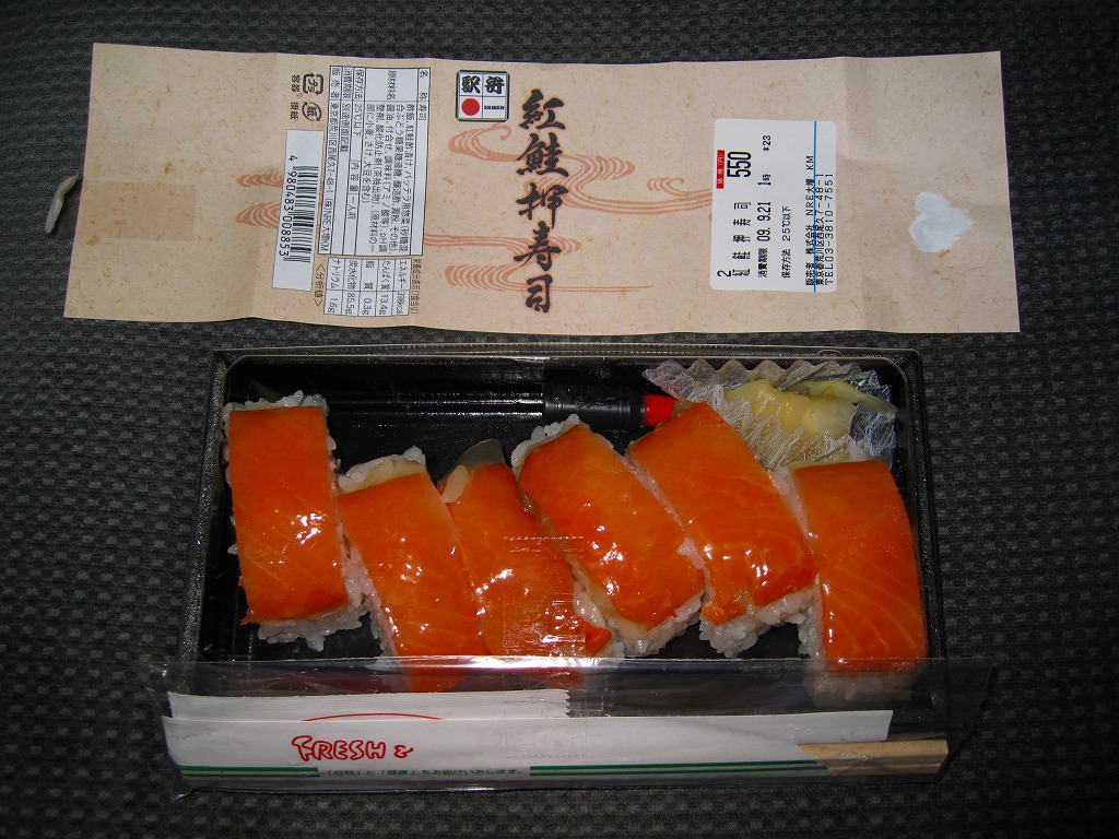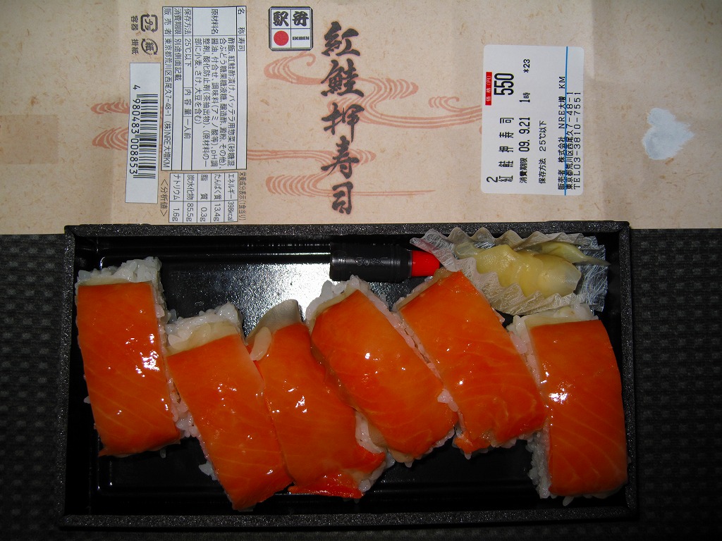 おそらく2007(平成19)年8月の東京駅寿司駅弁全面リニューアルで発売。内容は商品名どおりの、紅鮭のバッテラが6切れ。紅鮭の紙切れで酢飯を食べる腹の足し。駅弁の鮭押寿司は八戸でも新潟でも鮭が酢漬け紙切れだったと思うので、もともとそういうものだと思うべきなのだろうか。ネット上ではこの価格でこの味は良いぞというコメントが多かった。見た目を変えず、2011年までに商品が大船軒へ引き継がれた。