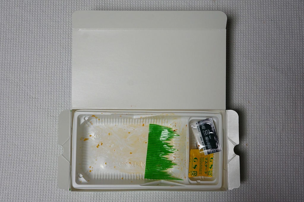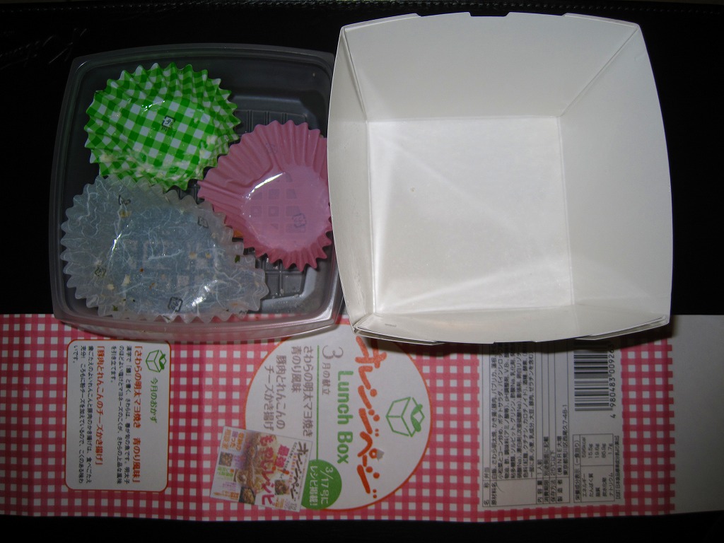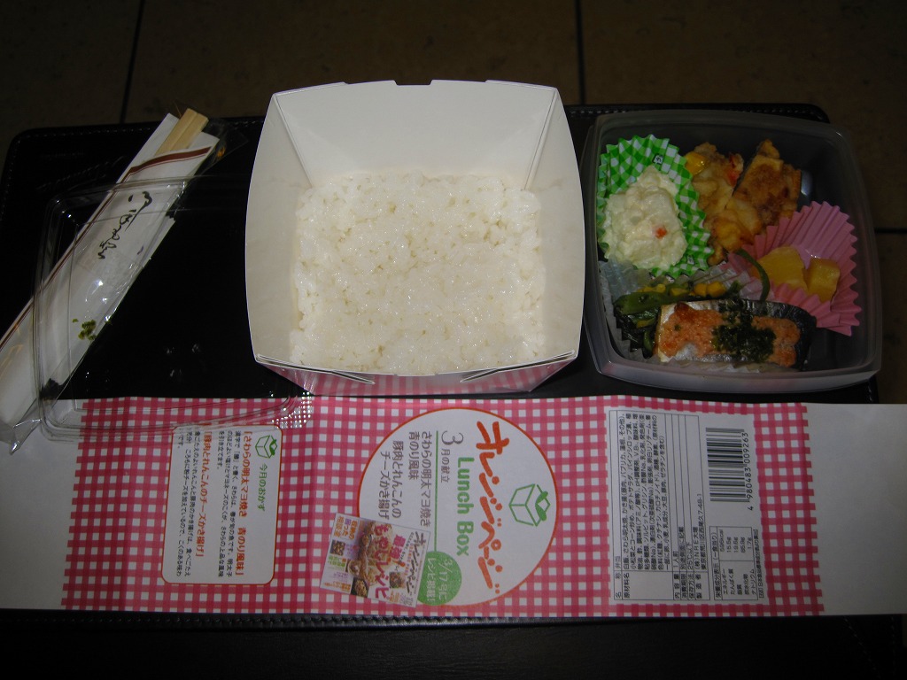 2010(平成22)年2月に発売か。耐水性の真っ白なボール紙を組み立てた容器に、おかずのトレーと一体化した透明なふたをして、商品名と掲載誌と中身などを書いた掛紙で巻く。中身は底面に白御飯を敷き、トレーに「さわらの明太マヨ焼き 青のり風味」と「豚肉とれんこんのチーズかき揚げ」、小松菜のコーン炒め、ポテトサラダ、パイナップル。おかずに対して御飯が多い、おしゃれな軽食弁当。
