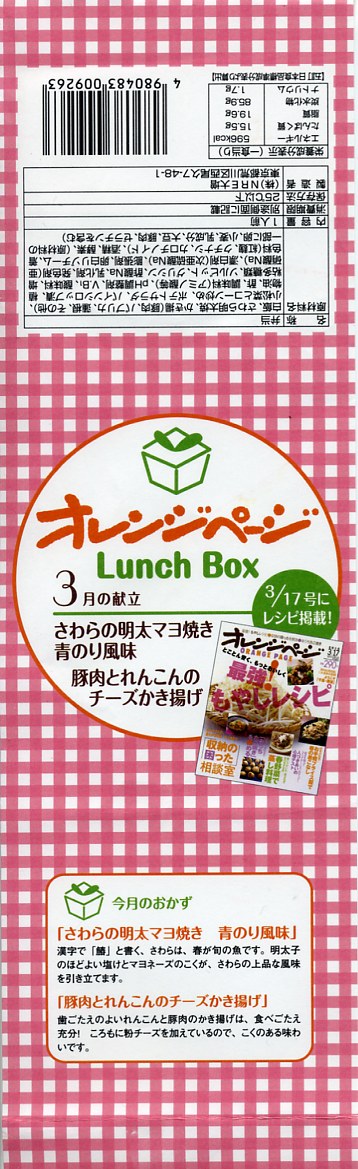 該当の雑誌を読んだことがないので詳細は分からないが、1985年創刊の料理雑誌「オレンジページ」内のレシピ記事と中身が連動しているらしい。だから掛紙には「3月の献立」とあり、以後も毎月新しいものが東京駅などの一部の駅弁売店で売られている。雑誌と同じ名前の発行元である株式会社オレンジページは、2001(平成13)年12月になぜかJR東日本に買収されており、こんなタイアップが可能なのだろう。月替わりで丸1年間販売された模様。