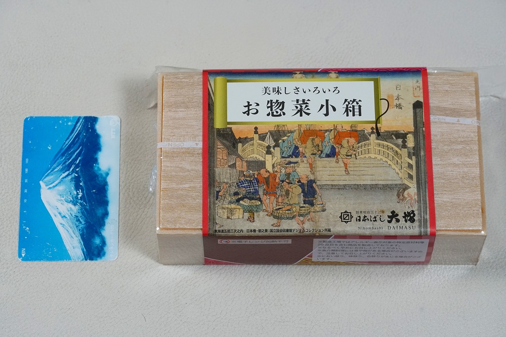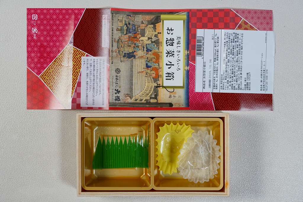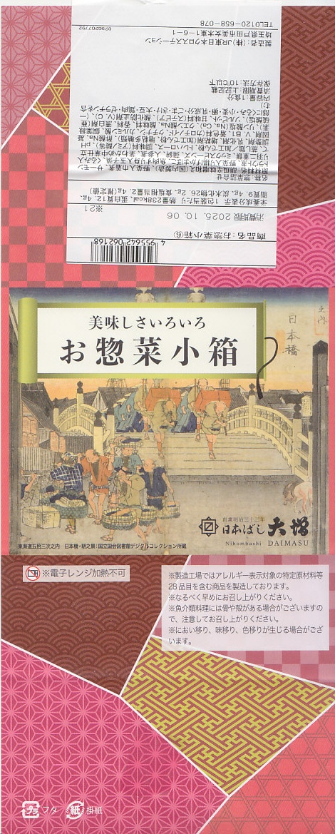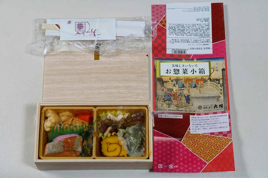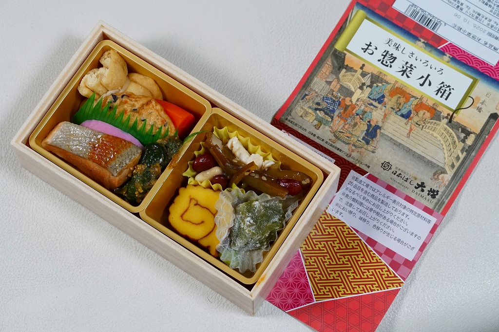 2025(令和7)年8月18日に各地で発売か。淡い木目調の発泡材容器に、商品名と日本橋の浮世絵を描いた掛紙を巻き、駅弁売店で売る姿は駅弁そのもの。中身は商品名のとおり、米飯が入る弁当でなく、サーモントラウト煮とかまぼこ、きんちゃくとにんじんの煮物と揚げかまぼこ、茎わかめ、蒸し鶏、伊達巻、きゅうりの辛味噌和え、煮豆を詰めた、おかずだけの商品。まるで幕の内弁当から御飯を省略したような構成で、日本ばし大増ブランドの商品でもあり、価格もそれくらいのものになっている。内容と価格で酒のつまみからちょっと外れた感じで、駅弁売店でこれを買う理由をイメージしにくいものの、今回の試みはどうなるだろうか。