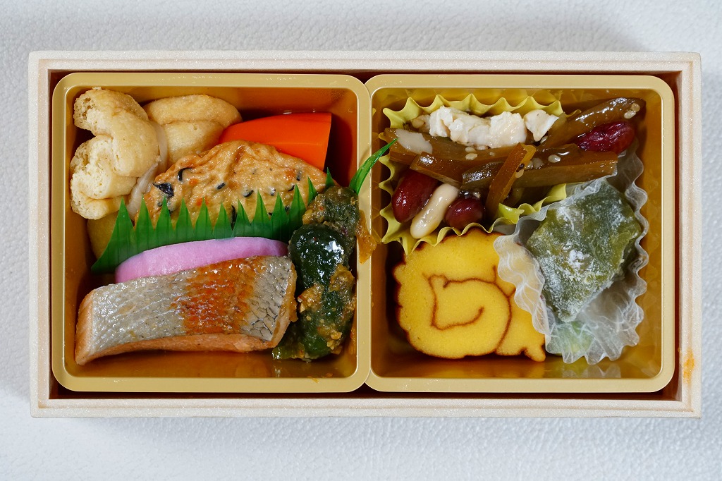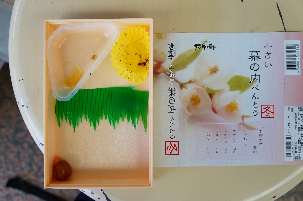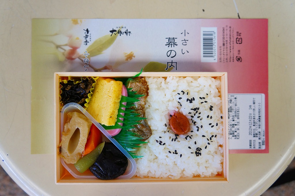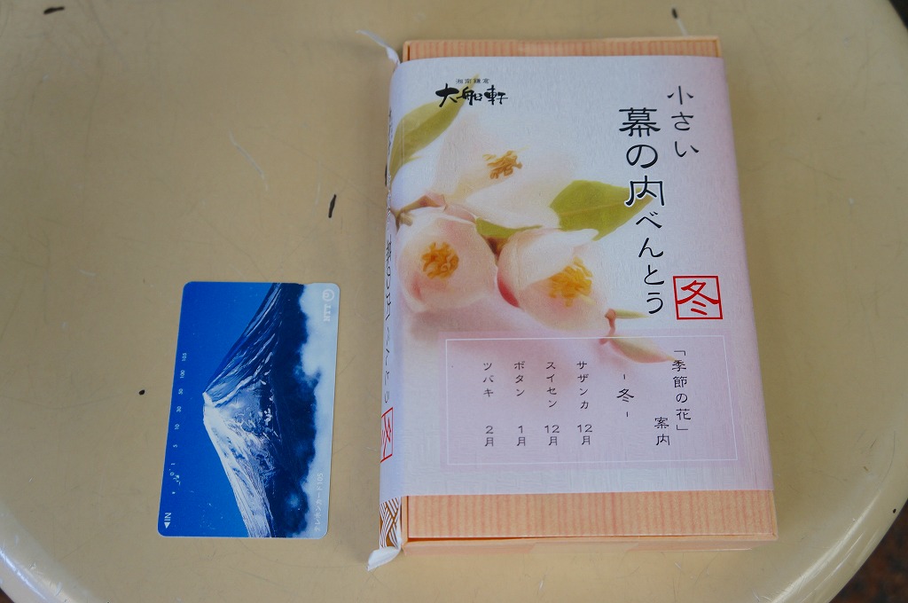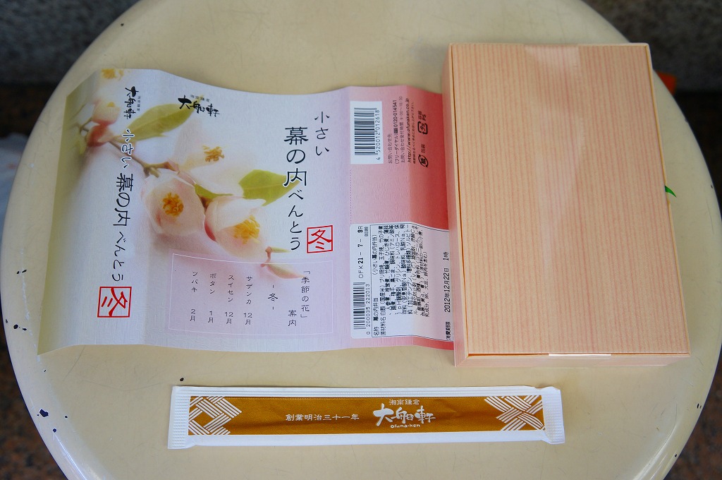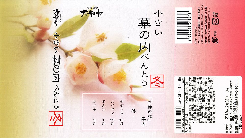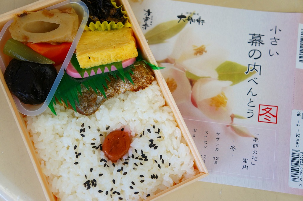 2012(平成24)年12月の発売か。調製元は大船駅の駅弁屋だが、東京駅や小田原駅などのNREの駅弁売店「駅弁屋」シリーズで販売する商品である模様。コンビニ弁当の半分くらいの大きさしかない容器に、日の丸御飯、シイタケやニンジンなどの煮物、ひじき煮、幕の内駅弁で「三種の神器」とされる焼き魚、かまぼこ、玉子焼が、しっかりと入っている。掛紙の使用を含め、その姿は一丁前の駅弁であり、その姿には大船駅の廉価版幕の内駅弁「かあさん弁当」を感じる。掛紙に「冬」とあり、サザンカからツバキまでの季節の花が印字されるが、中身に季節で回せる具材がないような気はした。販売は長続きしなかったのではないかと思う。