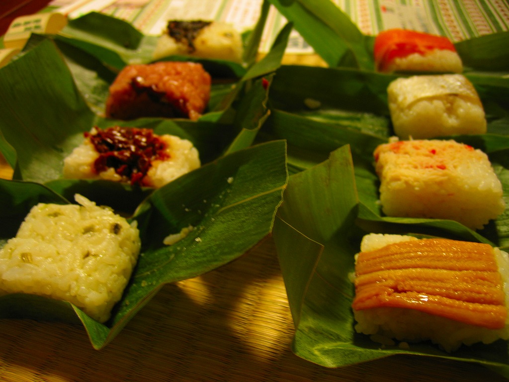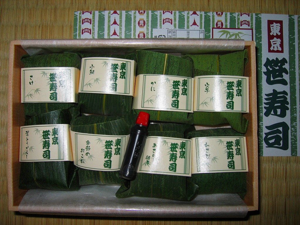 2007(平成19)年の秋頃に発売か。小柄な長方形で木目柄の容器に、駅弁の名前と中身を文字で書いた掛紙を巻く。中身は北陸の駅弁でなんとなく見た覚えがあるタイプの笹寿司で、笹の葉の中にアナゴ、カニ、小鯛、鮭、葉とうがらし、あさり佃煮を載せた寿司が1個ずつと、わさびの混ぜ寿司、赤飯が各1個で合計8つ。その個々に中身を書いた紙帯が巻かれる。