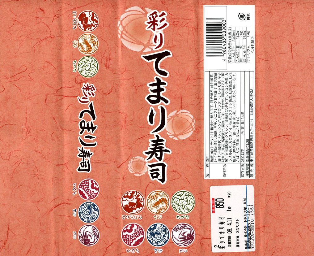 2009(平成21)年3月に発売。掛紙やしおりに書かれるとおり、シイタケを載せたとりそぼろ、ししゃもっこを混ぜたえび、辛子明太子を付けたたかな、玉子で巻いたいくら、ゴマ酢飯を使ったさけ、軍艦タイプのかにと、6種各1個の球形寿司が、この順序で直列にて各区画に収まり、この細長く赤い黒塗りの容器を掛紙で巻いている。850円も取るのに少量でさほどうまくないとは何事だと怒るか、価格も分量もお手頃で見た目も風味もかわいらしいとニッコリするか、主観による評価が分かれそうな商品だと思う。数か月間の販売か。