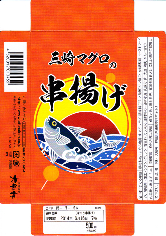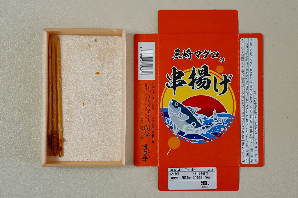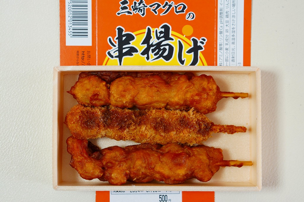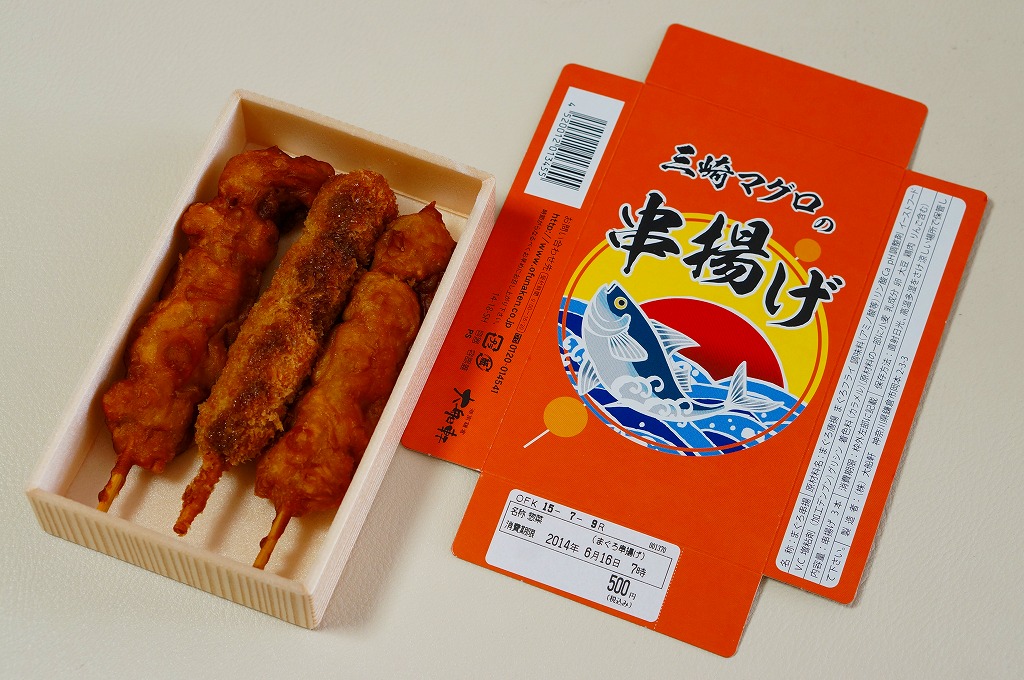 2014(平成26)の3月頃に、東京駅の駅弁売店「駅弁屋 祭」のレジ横でデビューか。商品名のとおり、三崎マグロの細長い串揚げが3本、小柄な容器に横たわる。分量でも価格でも、この売り場で先発の「国技館やきとり」と同じく、駅弁にもう1品加える、買ってもらうための商品か。調製元は大船駅弁の大船軒だが、大船駅で売られることはないと思う。一年半ほどの販売か。