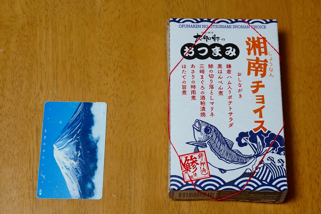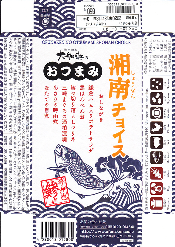 2020(令和2)年9月に東京駅の駅弁売店「駅弁屋 祭」で発売か。今までこの売店で売られてきた、大船駅の駅弁屋がつくる御飯のないおつまみ駅弁と同じサイズのコンパクトな容器を、今回は4分割にして、アジの切り落としマリネ、三崎まぐろの酒粕漬焼、アサリ時雨煮とホタテ旨煮、黒はんぺん煮と鎌倉ハム入りポテトサラダを入れてきた。知る人には分かる、アジやハムなどに込められた大船駅弁らしさ。JR東日本グループ会社の事業再編という不思議な理由により、2021年3月限りで終売。