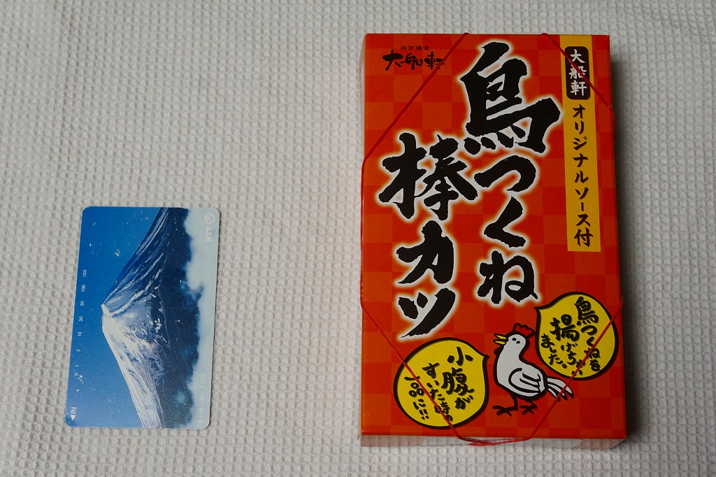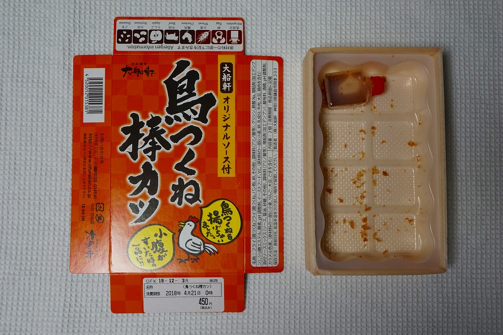 2018(平成30)3月に東京駅の駅弁売店「駅弁屋 祭」で発売か。小箱に収めた半透明のプラ製トレーに、商品名「鳥つくね棒カツ」、食品表示「鶏つくねフライ」なる棒状の鶏つくね揚げを2本入れ、ソースを添える。下記の商品「鳥揚げちゃった」と趣旨は同じで、そのリニューアルではないだろうか。ずいぶんと油っぽい気はしたが、揚げつくねの市販惣菜は初体験。1年間ほどの販売か。