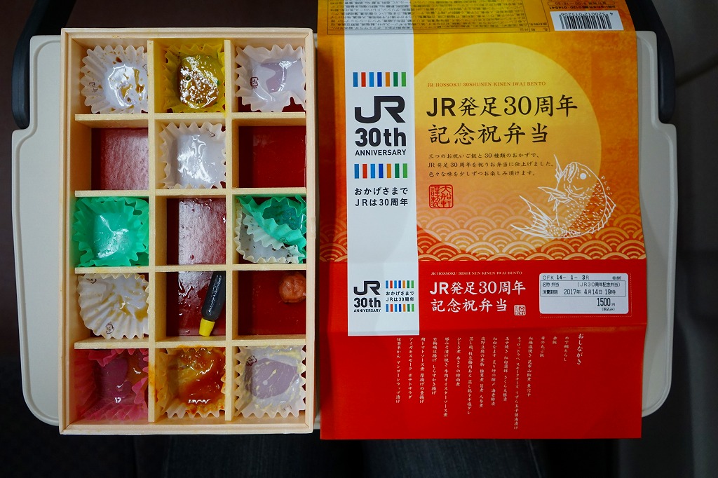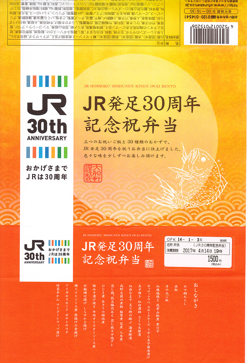 JR各社の発足30周年を記念して、2017(平成29)年4月8日から16日まで、東京駅の駅弁売店「駅弁屋 祭」「駅弁屋 踊」と新宿駅の駅弁売店「駅弁屋 匠」で販売。掛紙には商品名と記念の絵柄とおしながきと、JR各社が共通で使えそうな「おかげさまでJRは30周年」の絵柄を掲載する。