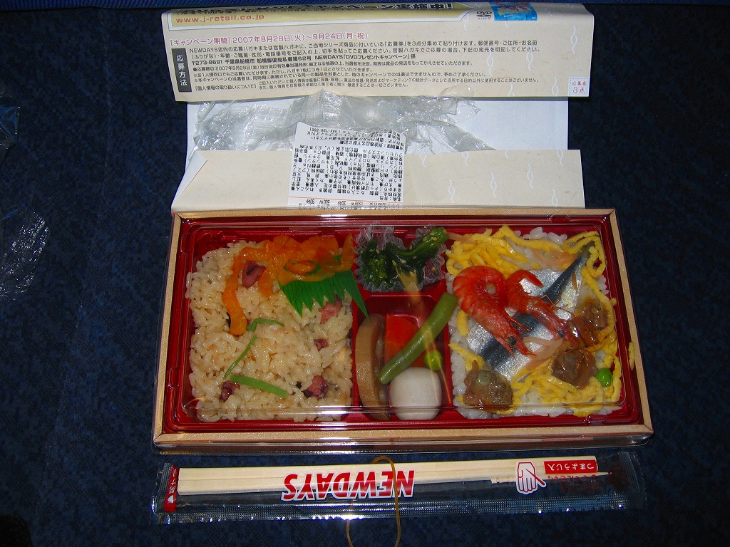 2010(平成22)年10月9日から11日まで東京駅で開催された「第12回東日本縦断駅弁大会」の開催記念駅弁。容器に経木のふたをかけ、江戸時代の錦絵を模して非なる絵柄の掛紙で巻く。中身は日の丸俵飯に焼鮭、かまぼこ、玉子焼、サトイモやニンジンなどの煮物、キス天ぷら、アサリ佃煮。内容こそ確かな幕の内駅弁であるが、掛紙も容器も中身も詰め方も、やっつけ感が先行。御飯の味は良かったのだが、これはどうしてしまったのだろうか。