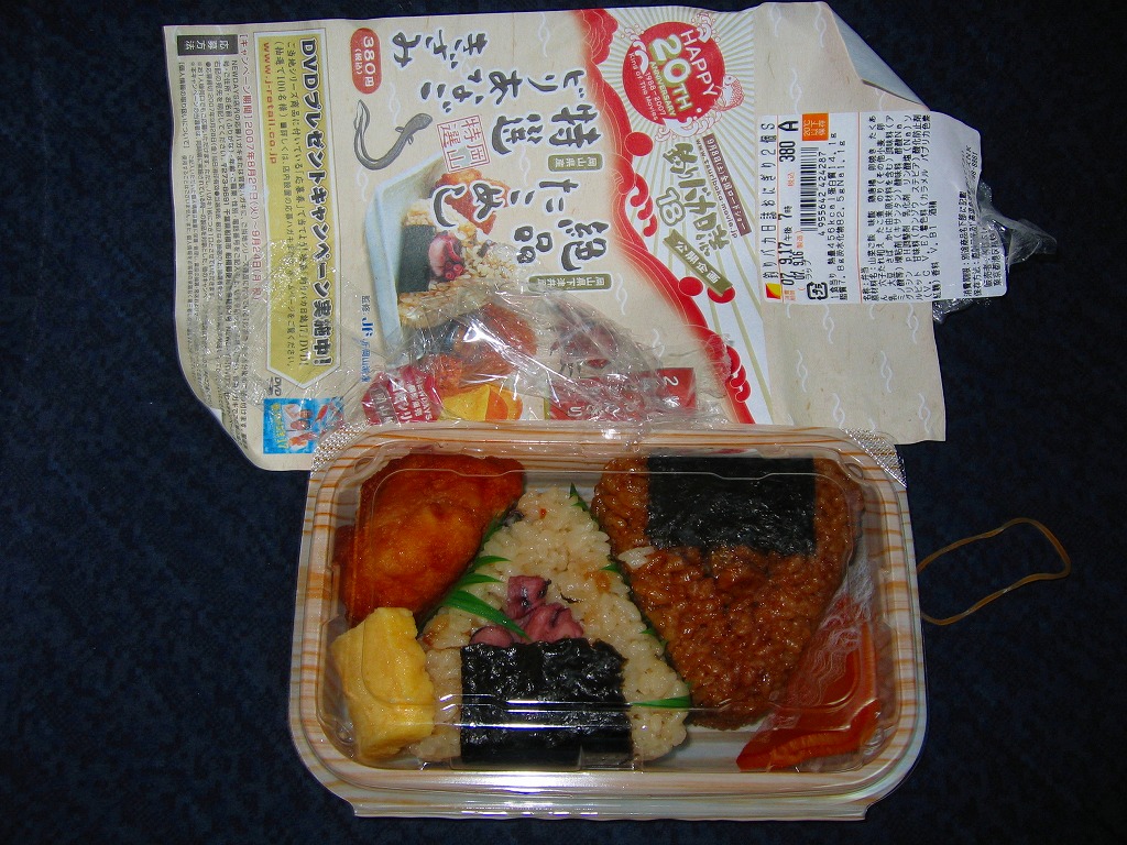 映画のロケ地である岡山にちなんだという中身は、タコ煮付き山菜おにぎりとあなごきざみ付き味飯おにぎりが各1個入り、鶏唐揚と玉子焼とタクアンを付ける。見栄えはやや駅弁っぽいが、風味はコンビニのもの。東日本キヨスク改めJR東日本リテールネットの販売だが、調製はNREの名義になっている。