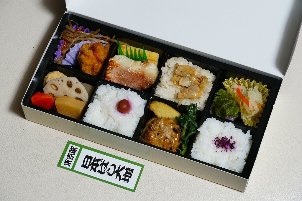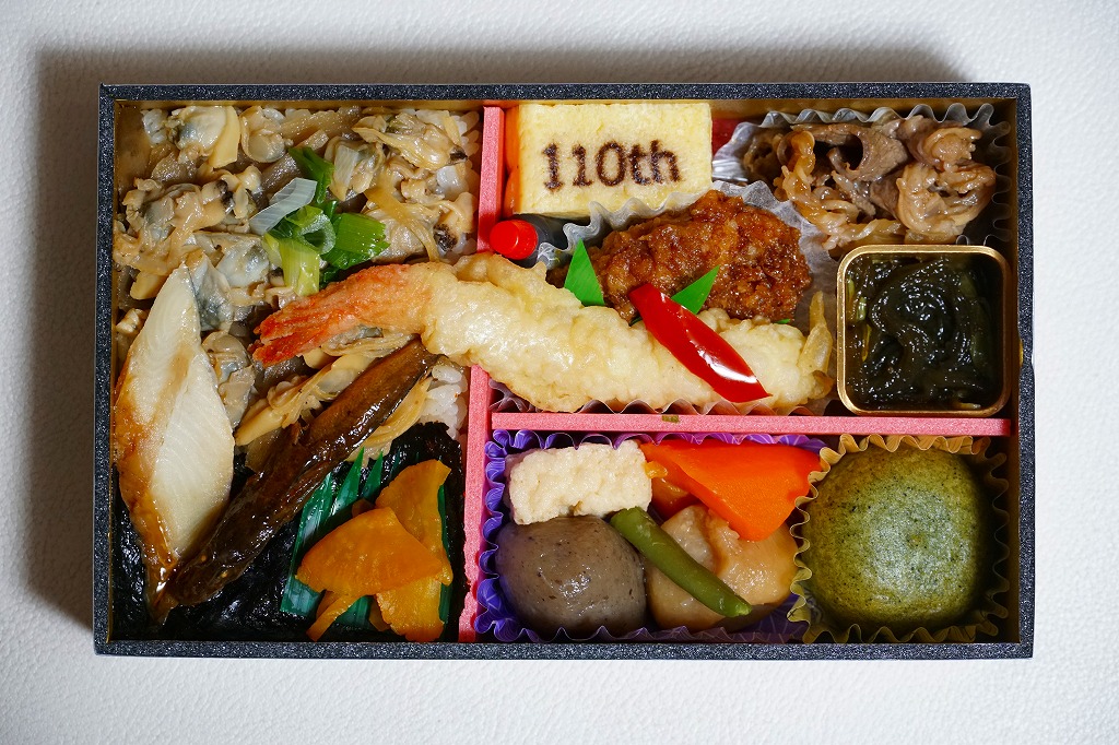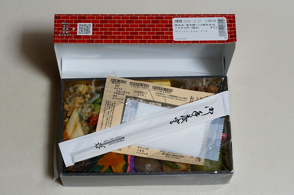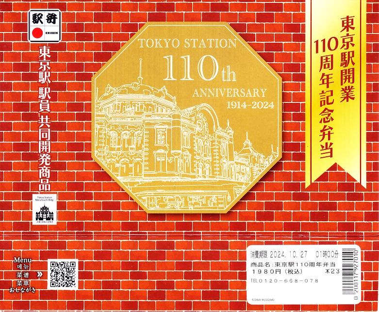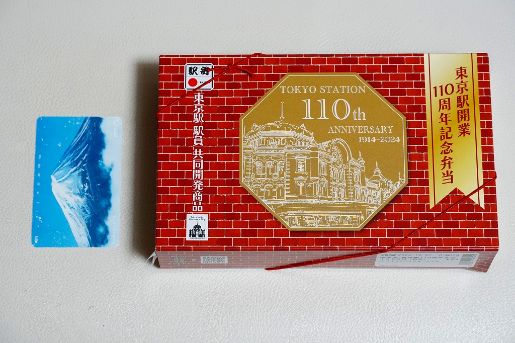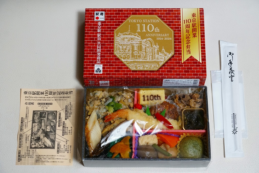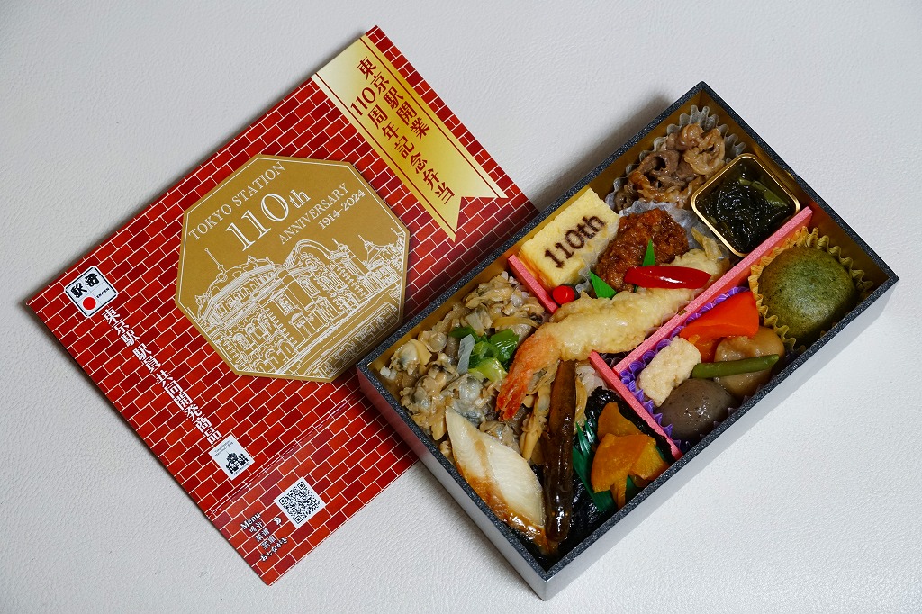 2024(令和6)年10月18日に東京、新宿、上野、大宮の各駅で発売、12月まで販売の予定。その名のとおり、東京駅の開業110周年を記念した弁当。ふたの絵柄は東京駅のイメージどおりの丸の内駅舎と赤レンガ。中身は東京駅とJR東日本エリアの新幹線終着駅のある県にちなんだといい、記念焼印入り玉子焼、東京の深川めし、はぜ甘露煮、煮穴子、酒悦のつぼ漬、海老天ぷらなどと、福井のチキンソースカツ、厚揚げの煮たの、里芋ころ煮などと、青森の牛バラ肉玉葱炒め、秋田のじゅんさい入りもずく酢、新潟の笹団子風焼まんじゅう、山形の玉こんにゃく。見た目でも食べても、中身がぎっしり賑やか。