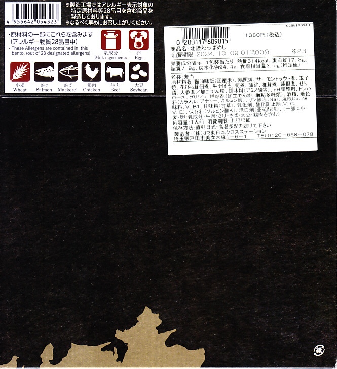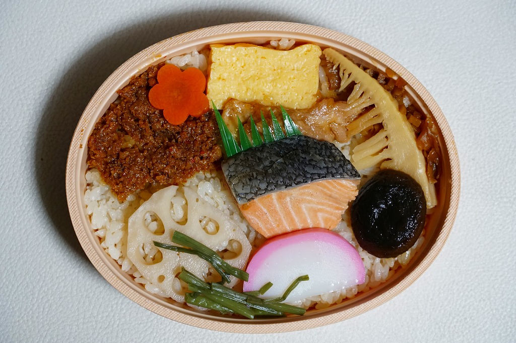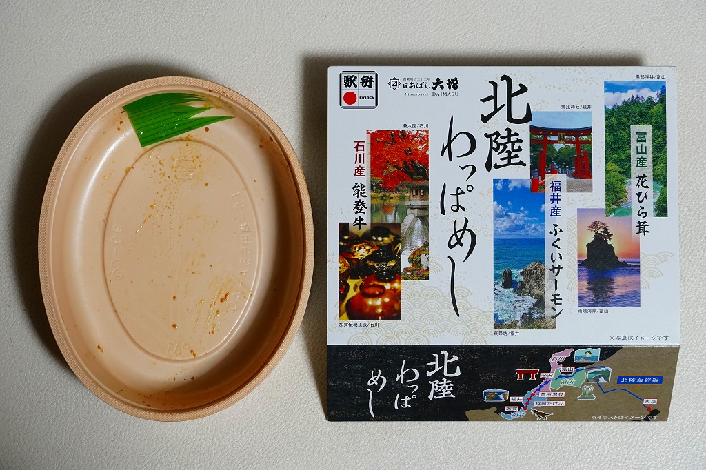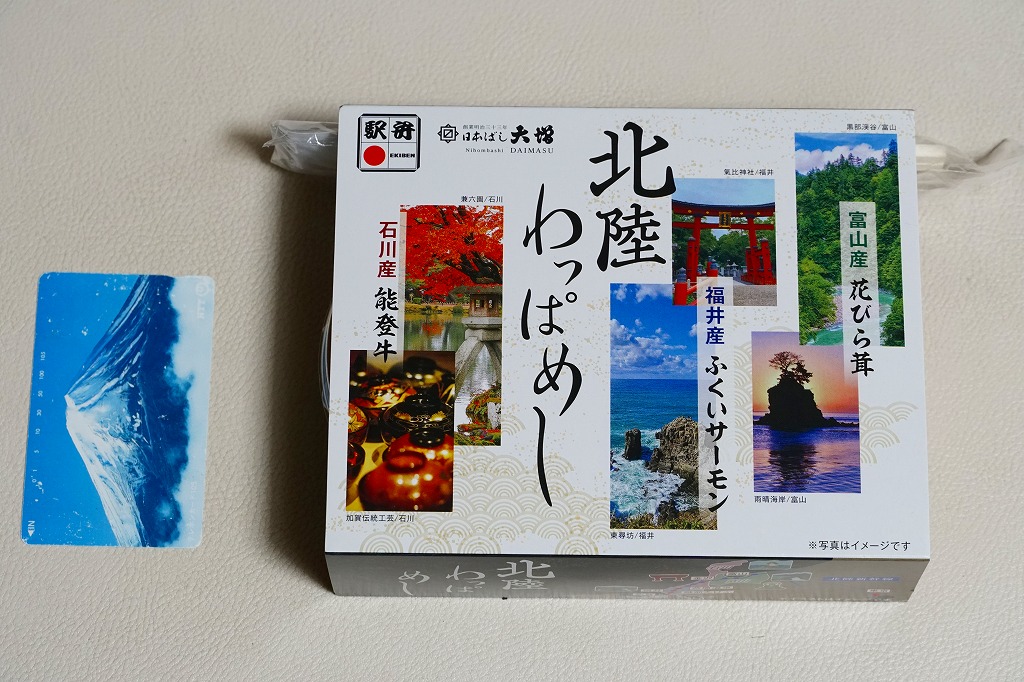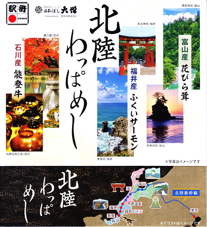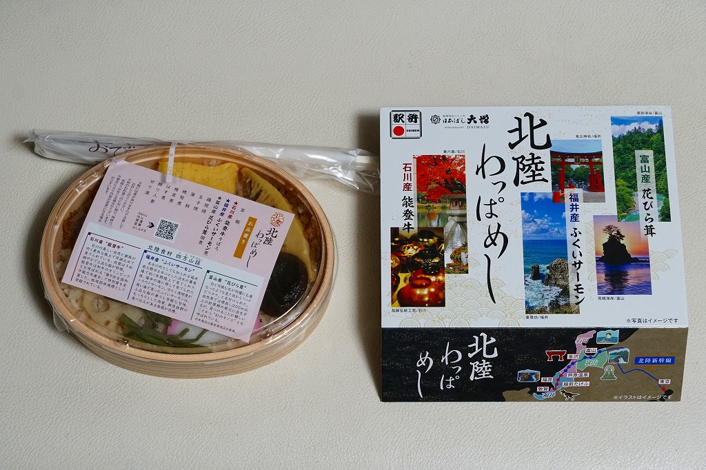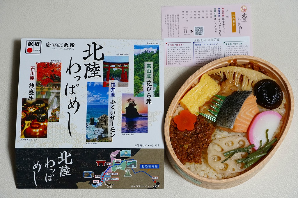 JRグループの観光キャンペーン「北陸デスティネーションキャンペーン」の開催に合わせて、2024(令和6)年10月1日に東京、新宿、上野、大宮の各駅で発売。スリーブの絵柄はキャンペーンの対象エリアである、富山県と石川県と福井県の、略図と写真と食材名でできている。楕円形のプラ容器に茶飯を詰め、富山産の花びら茸佃煮、石川産の能登牛そぼろ、福井産のふくいサーモン煮、加えてかまぼこ、玉子焼、鶏照焼、たけのこ、しいたけ、にんじん、はす、せり。お米は10月に栃木県産コシヒカリ、11月に石川県産ひゃくまん穀を使うという。そぼろ丼のように見える幕の内弁当。2025年2月末頃まで販売する予定。