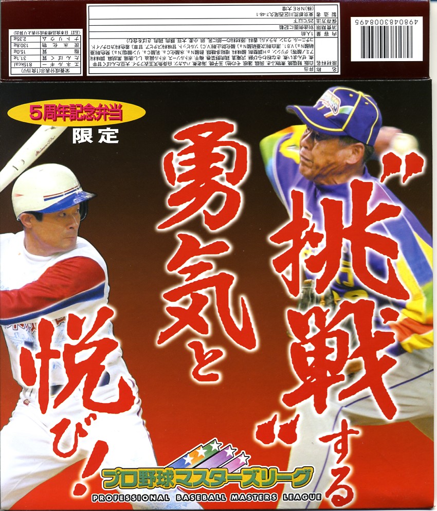 プロ野球マスターズリーグ5周年を記念して、2005(平成17)年11月3日から販売。黒いトレーを入れた正方形のボール紙箱は、フタに村田兆治投手と石毛宏典内野手の写真を載せ、裏ぶたに2005年度の日程表を記す。昭和の食卓をイメージしたという中身は、日の丸御飯に白身魚フライやハムカツ、海老や焼鮭や玉子焼など。日程表が1月22日までなので、その頃までの限定商品と思われる。