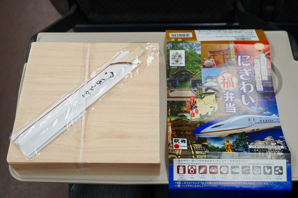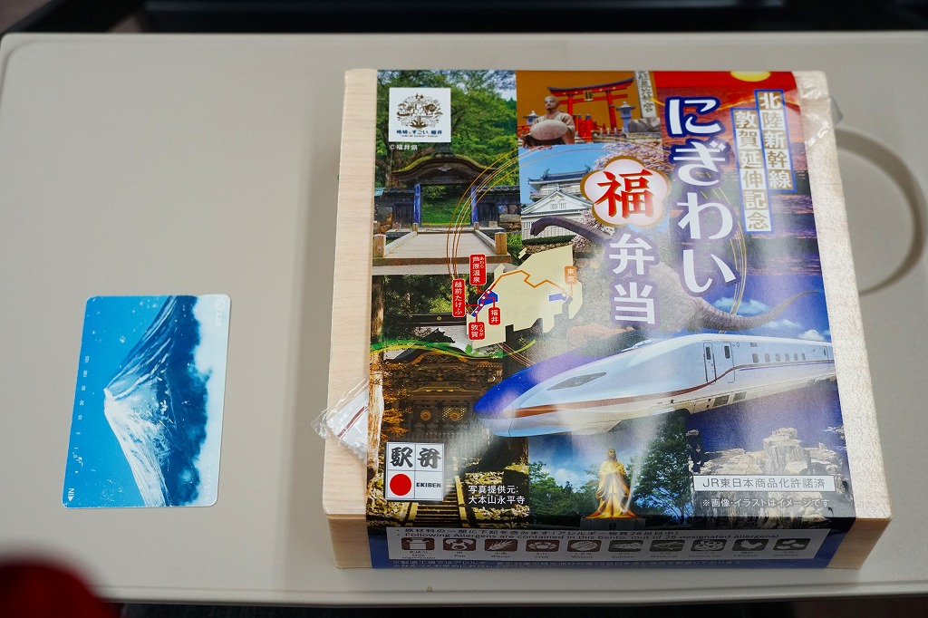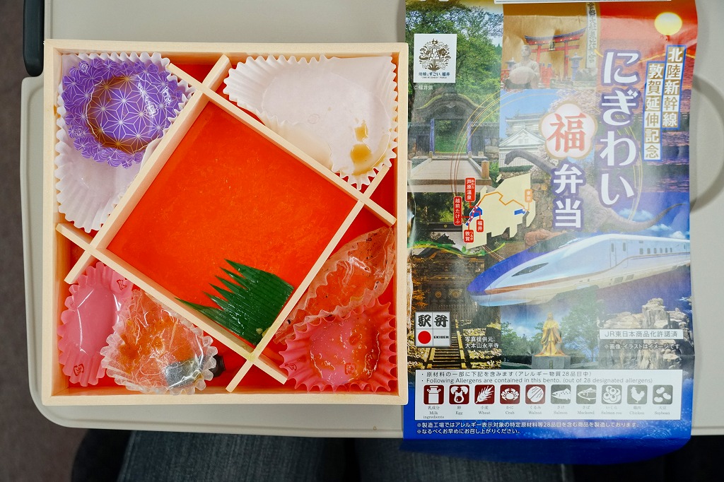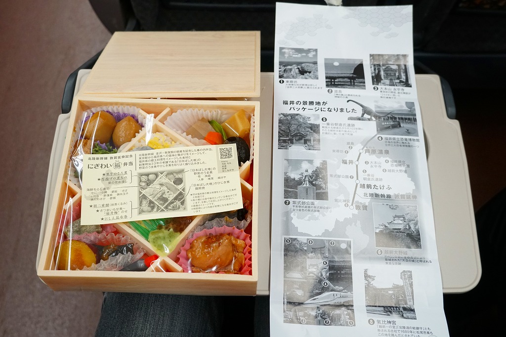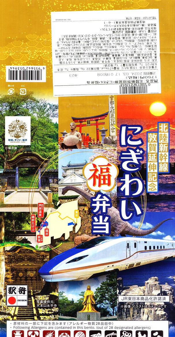 2024(令和6)年3月16日に、東京、新宿、上野、大宮の各駅で発売。同日の北陸新幹線の敦賀駅までの延伸開業を記念したもので、掛紙の絵柄も新幹線電車と路線図と、福井県内の観光名所の写真でできている。掛紙の裏面でも路線図と写真で福井県内の観光名所をアピール。中身は東京駅から福井県への延伸と繋がりをイメージしたとされる、海鮮ちらし寿司、里芋のころ煮と厚揚げの煮たのと菜の花お浸し、羽二重餅とさつまいも旨煮とにしん昆布巻、あとは日本ばし大増の煮物、ひじき煮と鶏照焼。羽二重餅を除き福井にしかないものは無いけれど、商品名と掛紙の絵柄と駅弁売店での大量陳列で、北陸新幹線の延伸開業を東京でアピールした。6月まで販売。