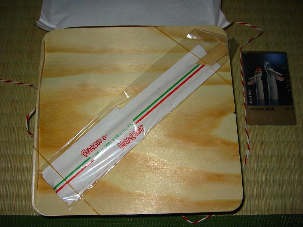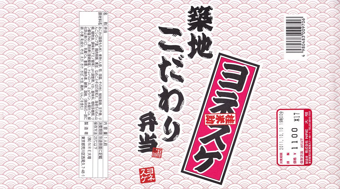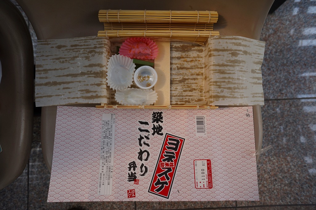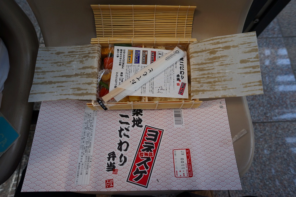 2011(平成23)年10月8日から10日までに東京駅で開催された「第14回東日本縦断駅弁大会」で販売された商品で、ヨネスケこと落語家の桂米助氏のプロデュースによるもの。まきすを用いた容器を、商品名を描いた掛紙で巻く。竹皮柄の紙に包まれた中身は、白おこわ、銀鮭粕漬焼、大山鶏の照焼、丹波黒豆、江戸焼玉子、タケノコやニンジンなどの煮物、りんごシロップ漬など。築地の老舗が詰まるという都会の弁当なのに、見ても食べても内容でも、整然の中に風情が感じられた。