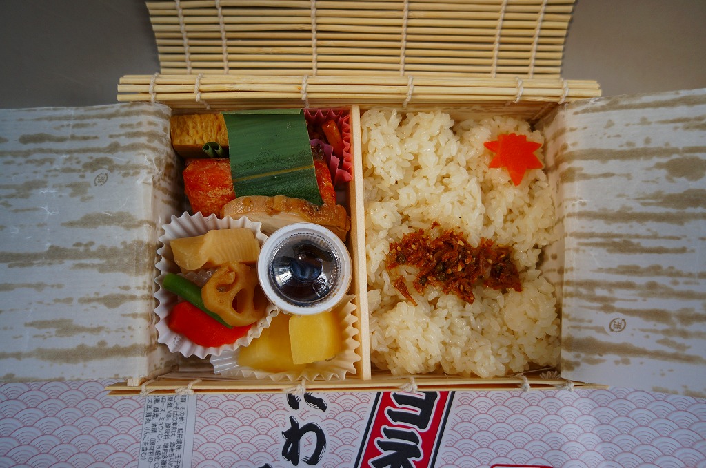 ふたと枠に経木を使った正方形の容器を、当時そのままのデザインの掛紙で包み紅白の麻ひもでしばる。中身は日の丸御飯と焼マスに白身魚フライ、蒲鉾に玉子焼、鶏つくねに各種煮物など。いずれも昔の雰囲気を再現しながらもそれなりに高級感があり、国鉄時代に不味い不味いと言われていた幕の内駅弁より確実に上品であった。