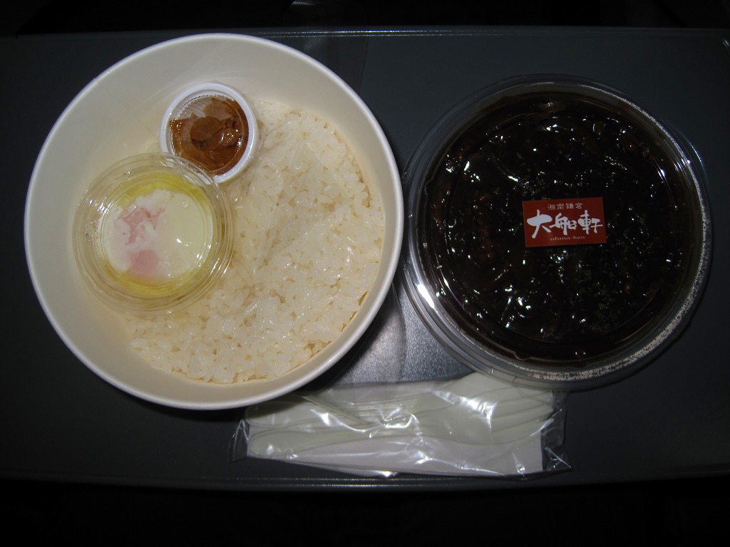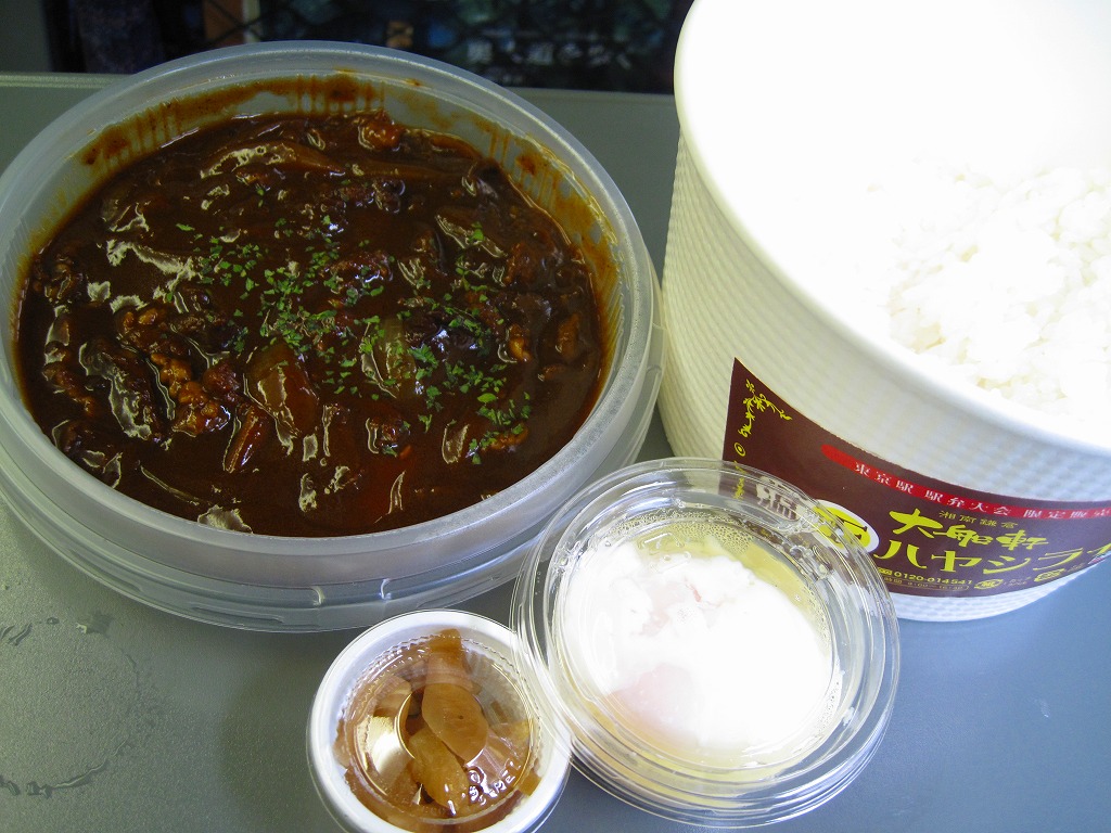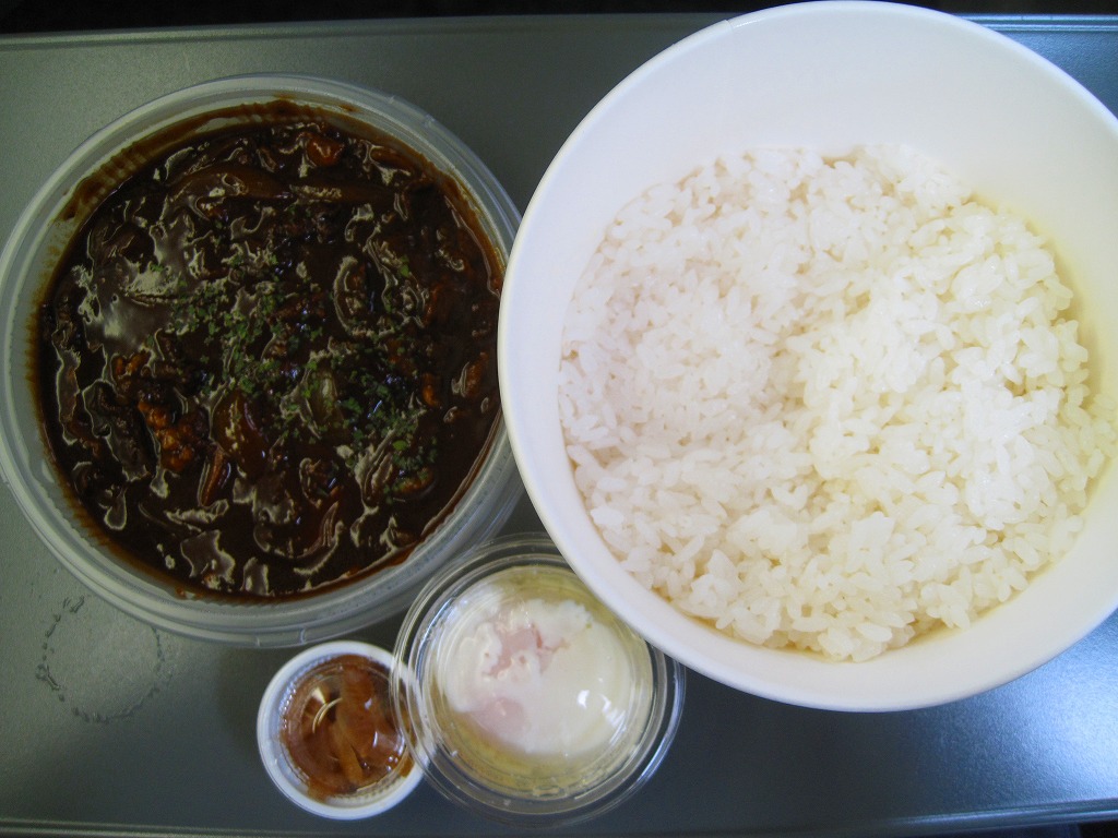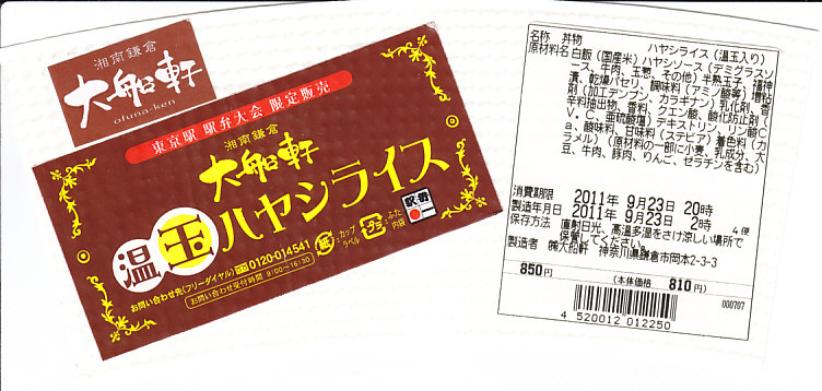 2011(平成23)年9月17日から25日まで東京駅で開催された「東北応援駅弁大会」で販売された商品。中身は商品名どおりの温泉玉子付きハヤシライスで、耐水紙製のカップに白御飯を敷き、半熟卵と福神漬をプラ製ミニカップで詰め、その上に牛肉とタマネギを混ぜたデミグラスソースを詰めた透明なふたをしたもの。