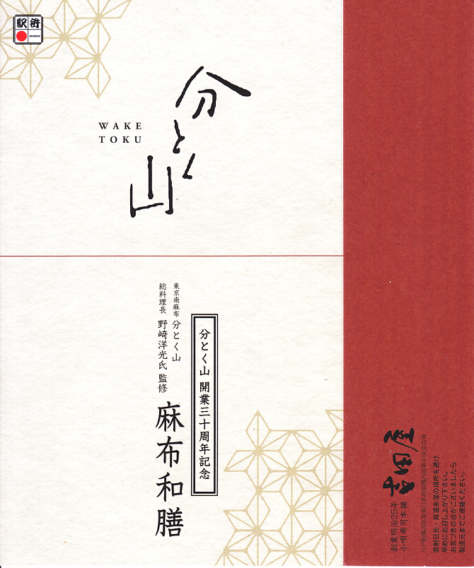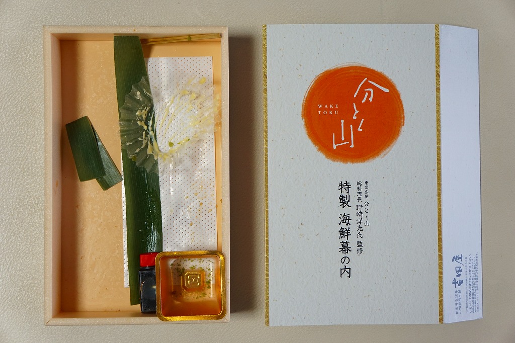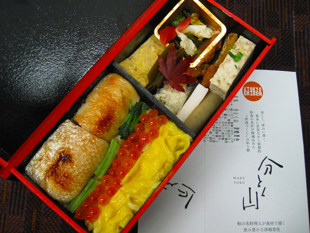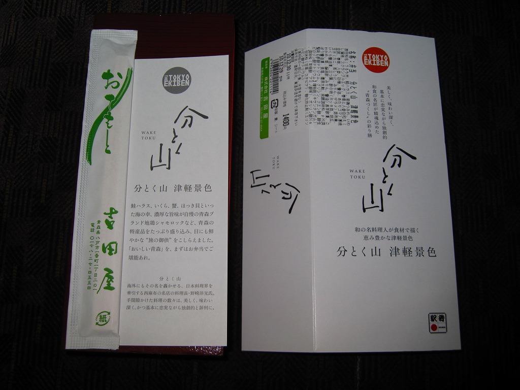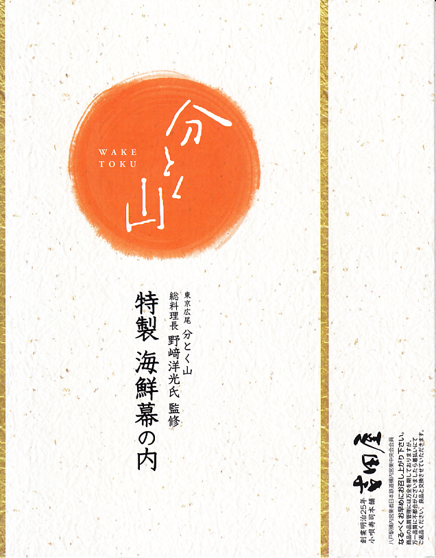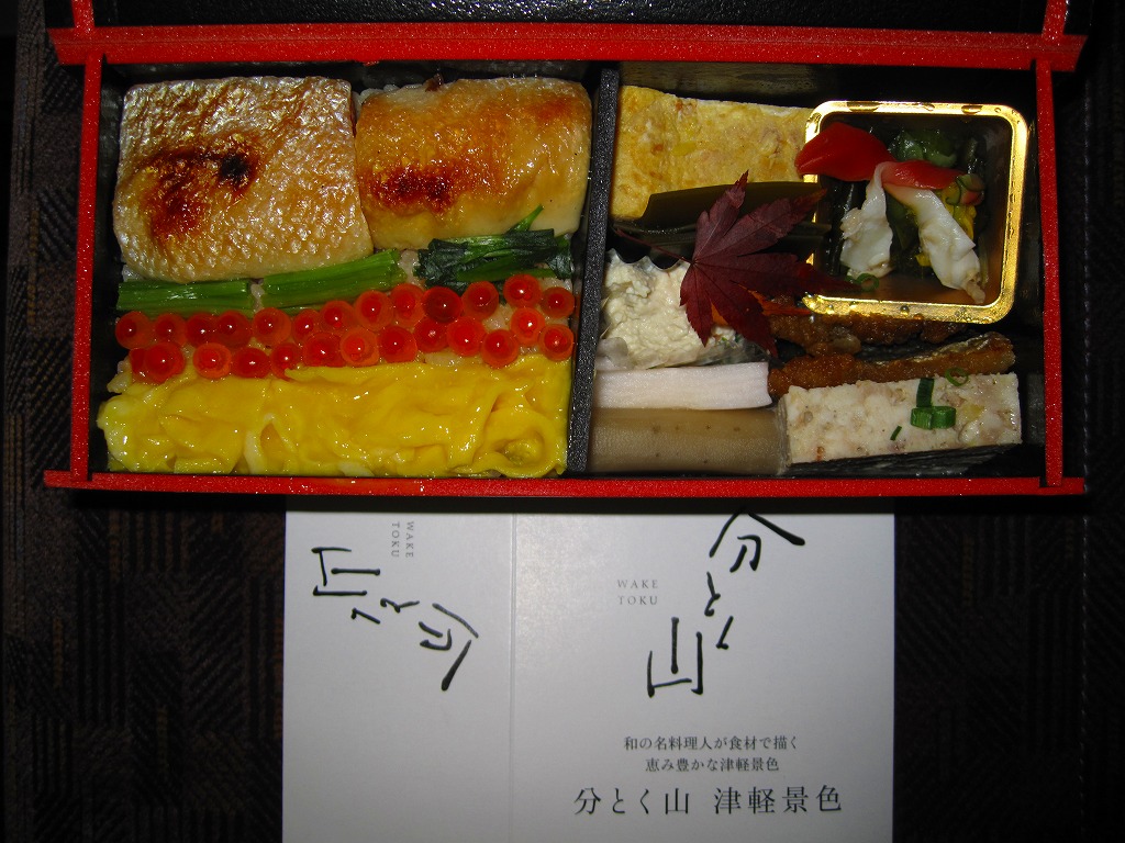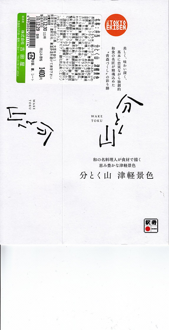 この姿ではいつ出てきたか不詳。2016(平成28)年の2月か3月に事実上東京駅から新宿駅へ移転した「ニッポンの駅弁」に加え、新宿駅の駅弁売店「駅弁屋 頂」や、東京駅の駅弁売店「駅弁屋 祭」でも時々見かけた。2010年発売の「分とく山津軽景色」と同じく、東京都西麻布の懐石料理屋のブランドを名乗り、調製元は八戸駅弁の吉田屋だが、スリーブに駅弁マークが付いていない。