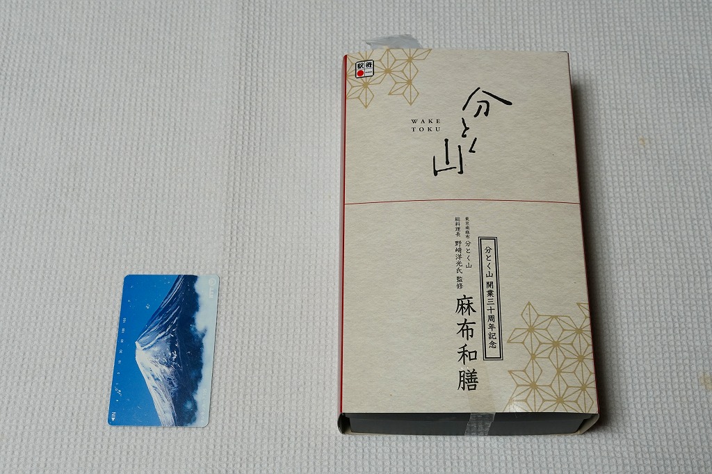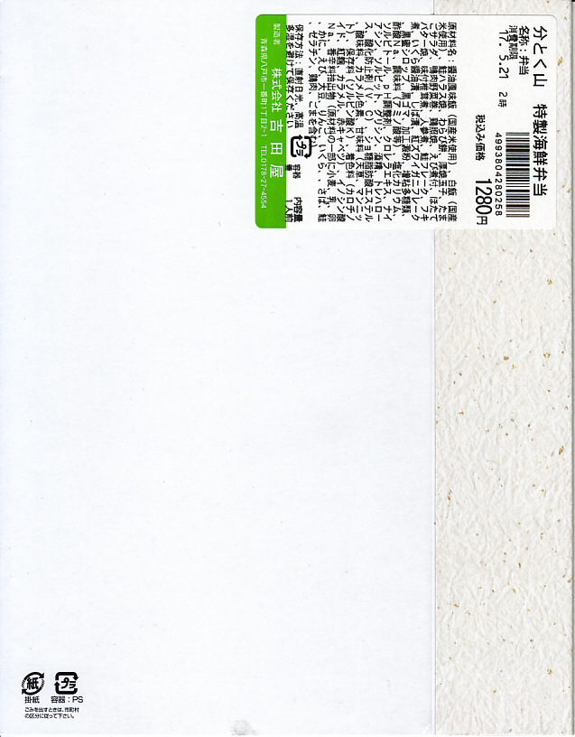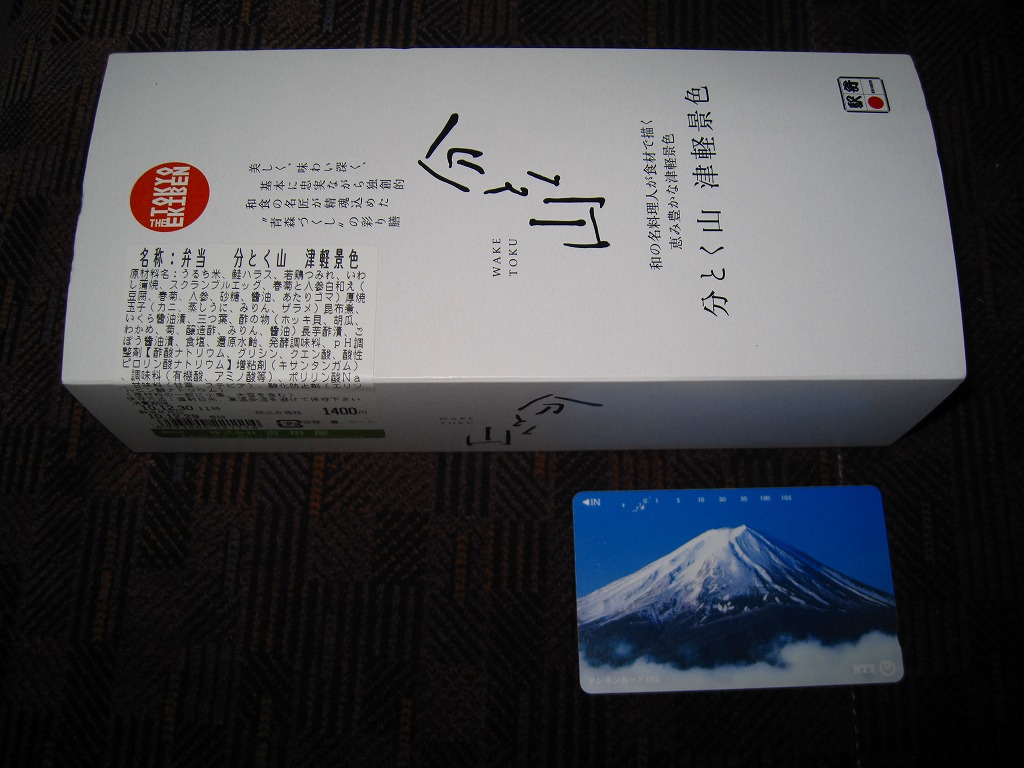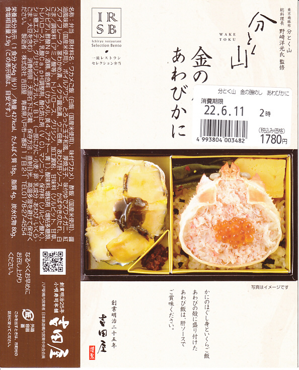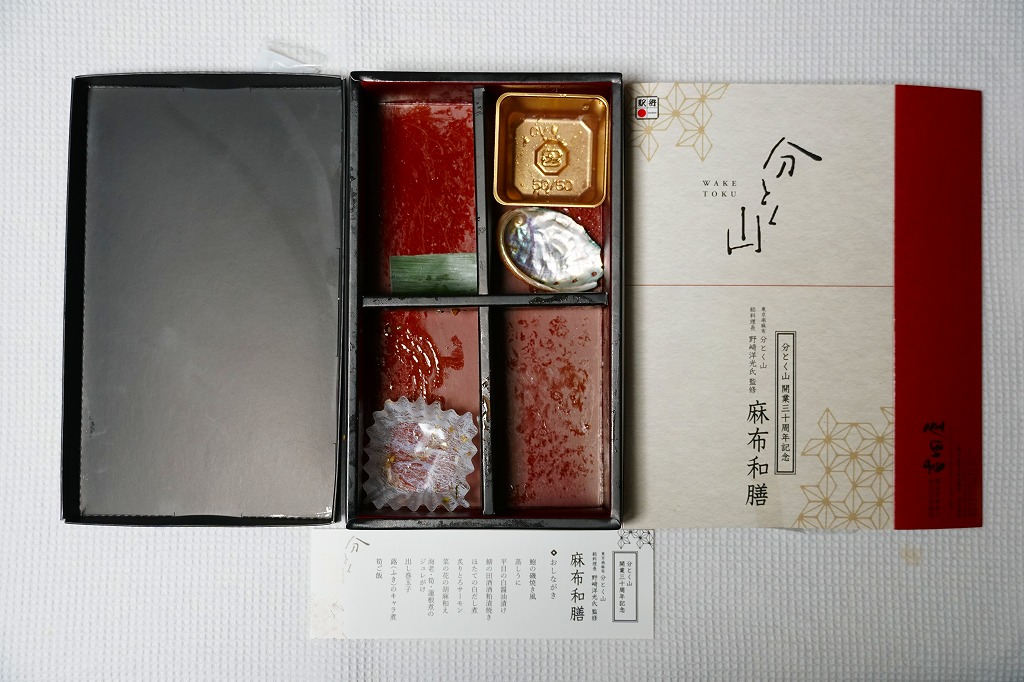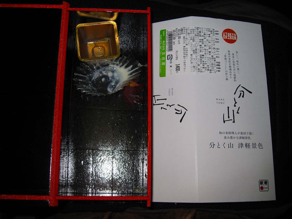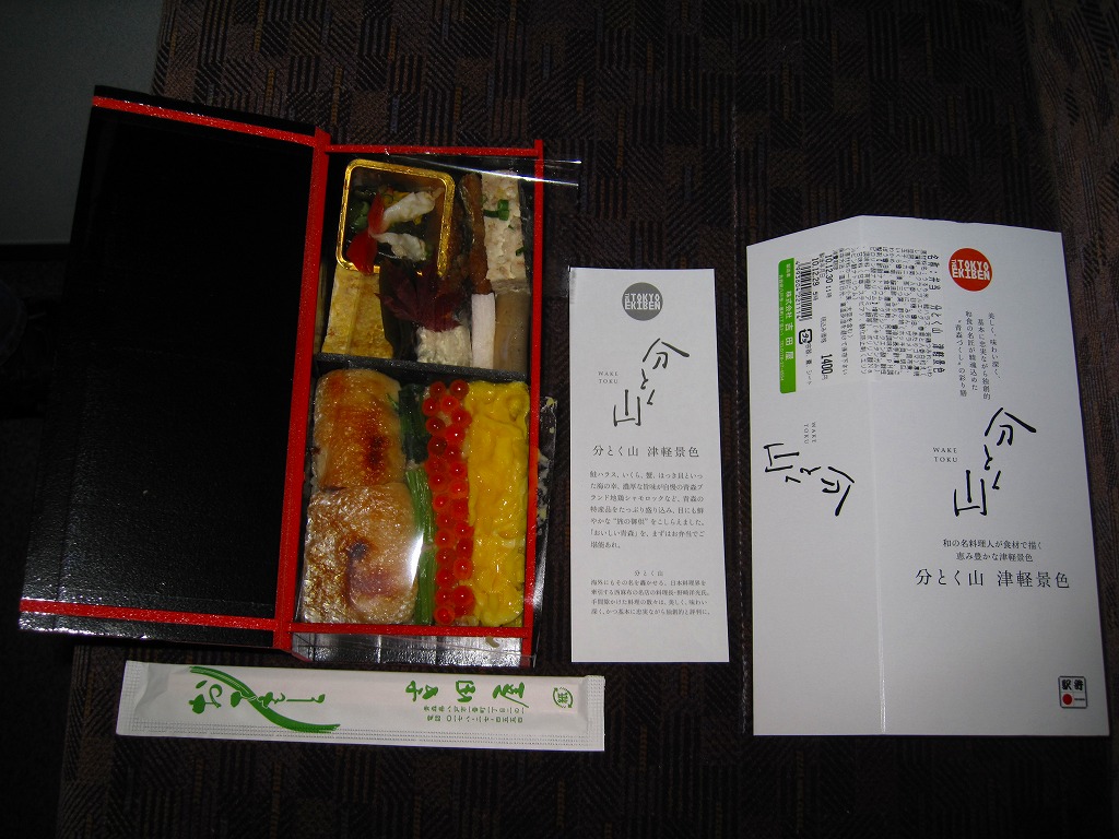 この姿ではいつ出てきたか不詳。2016(平成28)年の2月か3月に事実上東京駅から新宿駅へ移転した「ニッポンの駅弁」に加え、新宿駅の駅弁売店「駅弁屋 頂」や、東京駅の駅弁売店「駅弁屋 祭」でも時々見かけた。2010年発売の「分とく山津軽景色」と同じく、東京都西麻布の懐石料理屋のブランドを名乗り、調製元は八戸駅弁の吉田屋だが、スリーブに駅弁マークが付いていない。