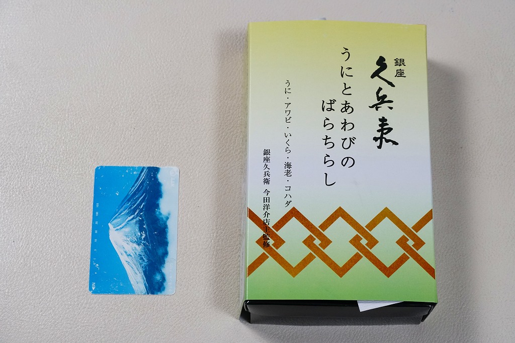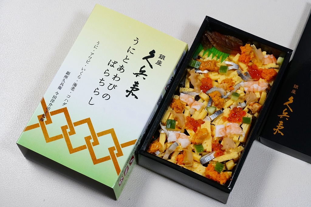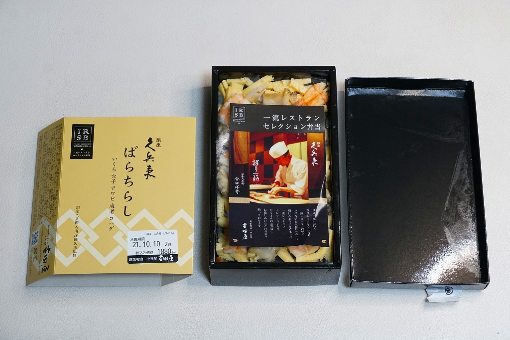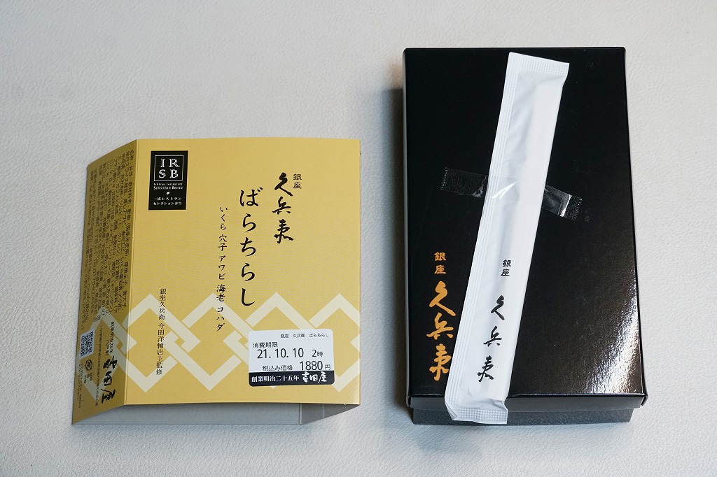 2023年か2024年の発売か。駅では2021年から売られた弁当「銀座久兵衛ばらちらし」シリーズのひとつ。「銀座久兵衛 今田洋介店主監修」として、スリーブと黒い紙容器にその名やロゴを記し、酢飯の上にうに、アワビ、いくら、海老、コハダと、玉子焼、しいたけ、きゅうり、刻み海苔、大葉を散らして、奈良漬けを添える。駅では売られていないが、こうして調製元の店舗で買えるほか、一部の高級スーパーに卸されているらしい。東京駅の駅弁売店「駅弁屋 祭」での復活は、あるかどうか。