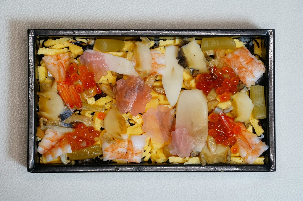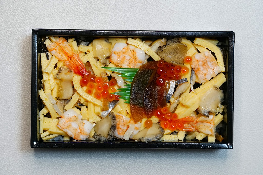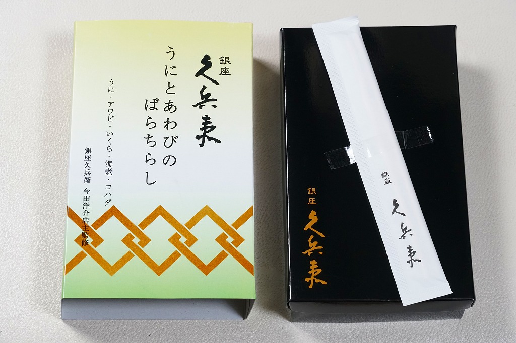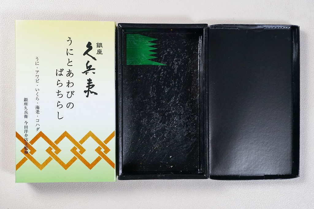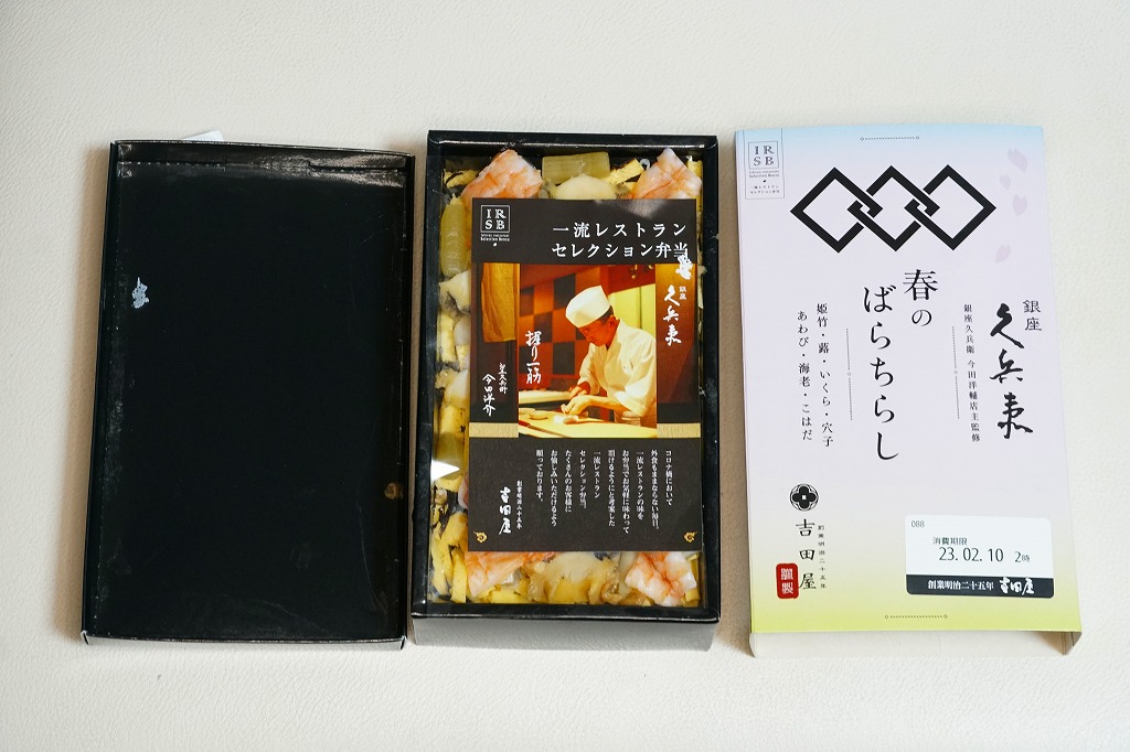 2023年か2024年の発売か。駅では2021年から売られた弁当「銀座久兵衛ばらちらし」シリーズのひとつ。「銀座久兵衛 今田洋介店主監修」として、スリーブと黒い紙容器にその名やロゴを記し、酢飯の上にうに、アワビ、いくら、海老、コハダと、玉子焼、しいたけ、きゅうり、刻み海苔、大葉を散らして、奈良漬けを添える。駅では売られていないが、こうして調製元の店舗で買えるほか、一部の高級スーパーに卸されているらしい。東京駅の駅弁売店「駅弁屋 祭」での復活は、あるかどうか。