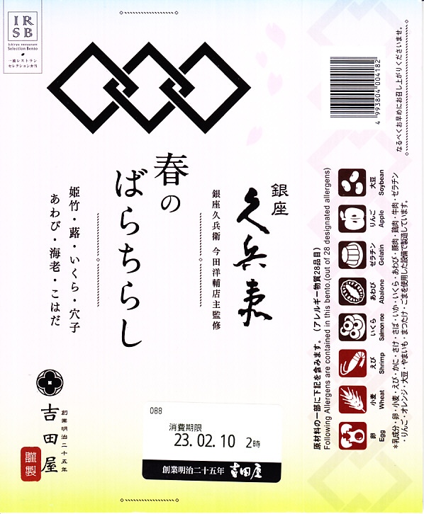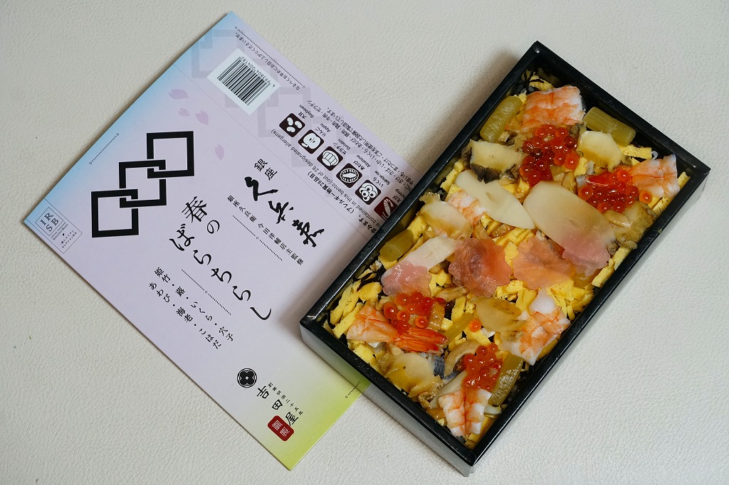 2023(令和5)年2月に東京や催事で発売か。駅では2021年から売られる弁当「銀座久兵衛ばらちらし」で、初めて季節の名を入れたもの。中身はスリーブに書いてあるとおり、姫竹、蕗、いくら、穴子、あわび、海老、こはだのちらし寿司。刻み海苔やスライス椎茸や厚焼玉子も混じり、大根酢漬が桜花の色と形で載る。