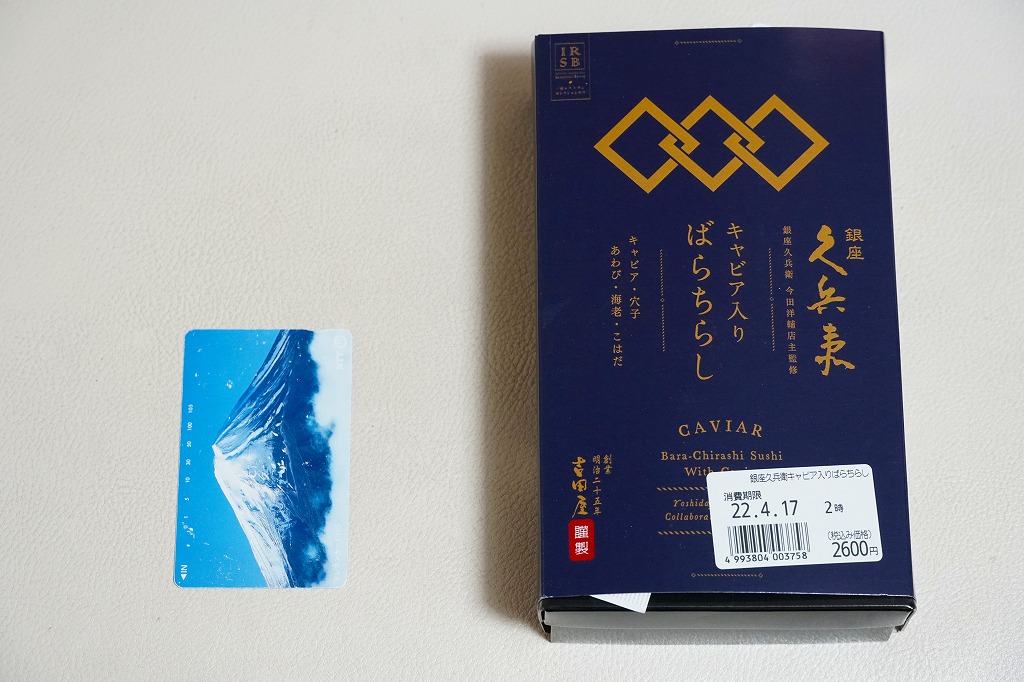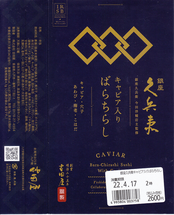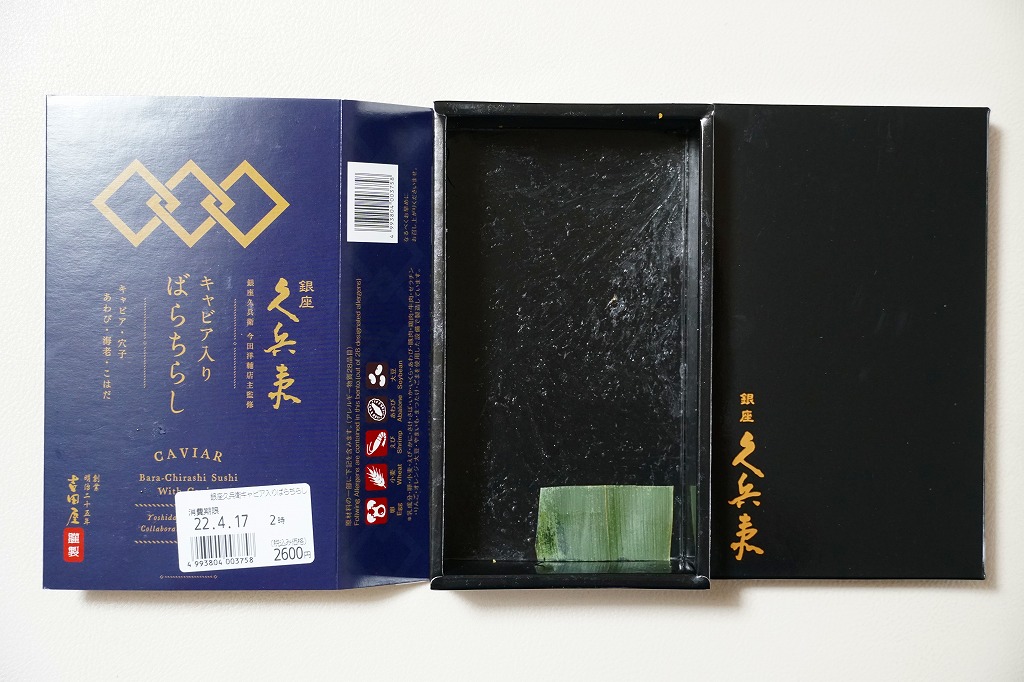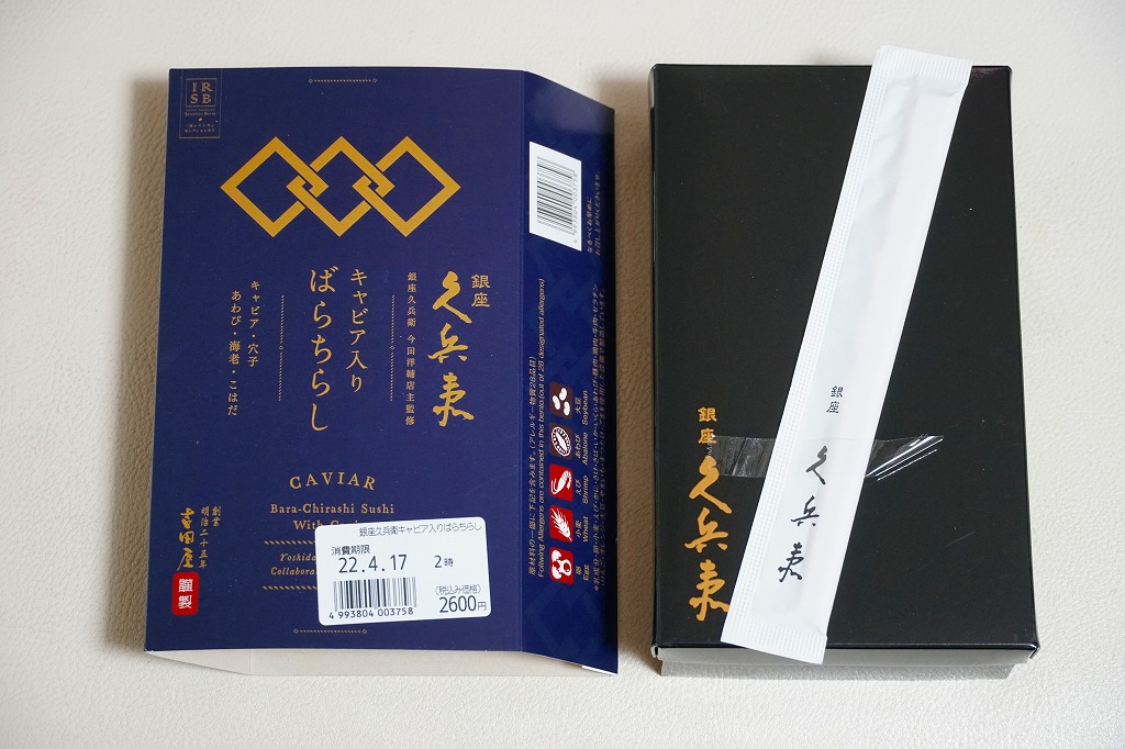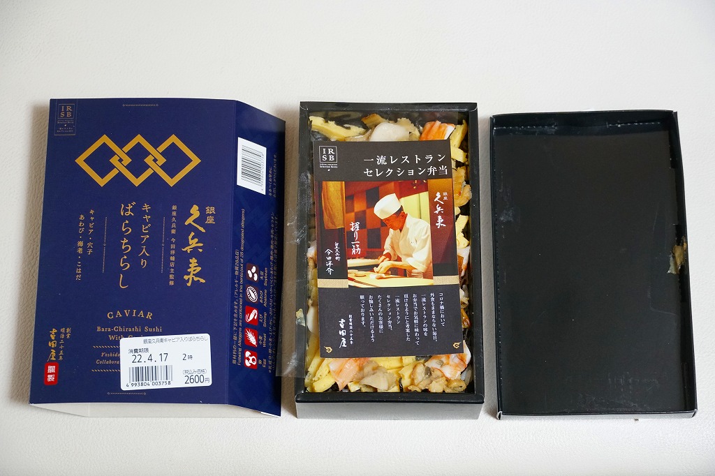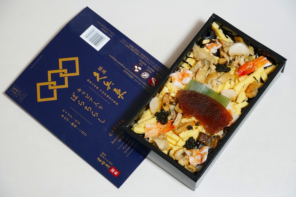 2022(令和4)年4月に東京や催事で発売か。下記の駅弁「銀座久兵衛ばらちらし」の、いくら、穴子、アワビ、海老、コハダのちらし寿司という中身にキャビアを加えて、その名前を加えてスリーブを伸ばして青黒くして、720円値上げした派生品の新商品だと思われる。東京駅弁の歴史でも時々出ては消える高級食材キャビアは、分量でも塩味の風味でも、本体のちらし寿司に影響を与えるものでなく、味は元のものと変わらないように思えた。こんなに高額な商品が駅弁として買われていくのであれば、すごいことだと思う。