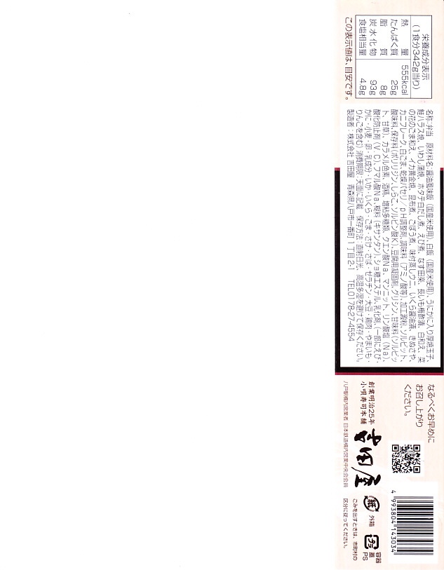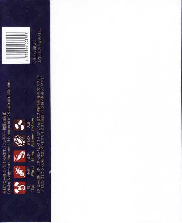 ところでこの掛紙、かつて昭和の国鉄時代に金沢駅弁の個性作であった、同じ名前の駅弁の掛紙がそのまま使われている模様。その証拠に右下の調製元情報には「金沢駅国鉄構内営業中央会」の文字がある。40代以上のごく一部のオールドファンには大変懐かしいものであろう。これも売り場で何の宣伝や解説もされていない。年内に終売か。