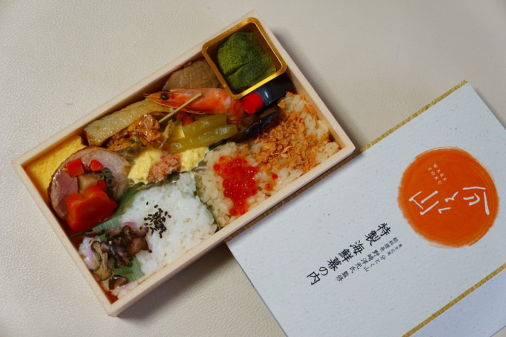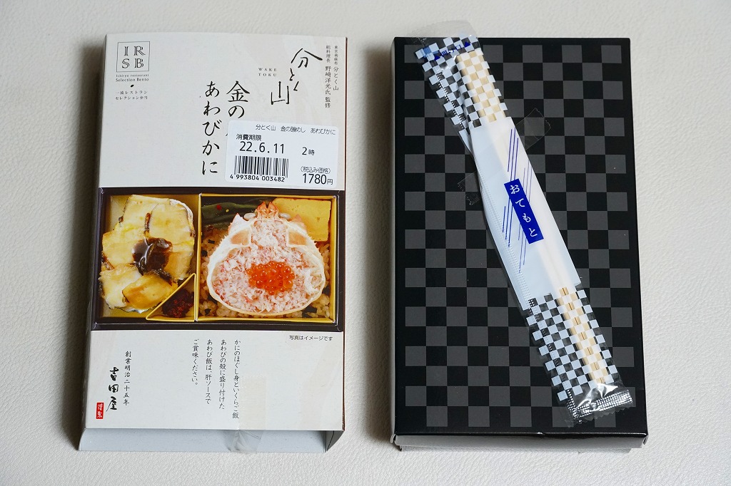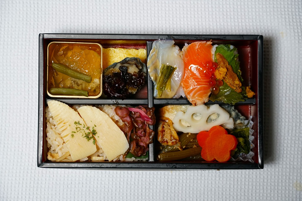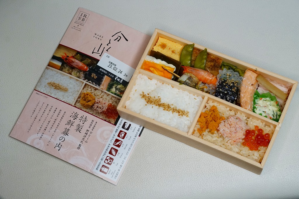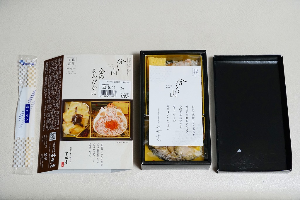 枠は木を使う木製風の長方形の容器に、ブランド名、弁当名、監修者名を記した和紙風の掛紙を巻く。薄手のプラ製トレー4つに収まる中身はそれぞれ、べにズワイガニのちらし寿司、カモの治部煮、アナゴ御飯、牛肉しぐれ煮やカマボコなど。