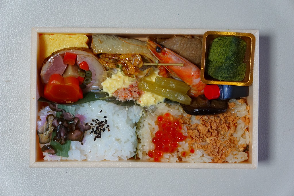 黒塗りの容器に、この駅弁売店の多くの商品でデザインを共有する白いボール紙の枠にはめる。中身は半分が茶飯の上を鮭ハラス、ミツバ、イクラ醤油漬、スクランブルエッグで覆う御飯で、半分がウニとカニの玉子焼、イワシ蒲焼、鶏つみれ、ホッキ貝、ナガイモやごぼうなど。サケがまるで塩辛で、御飯が3センチ厚もある、手にも口にも胃にも重たい感じ。2015年までの販売か。