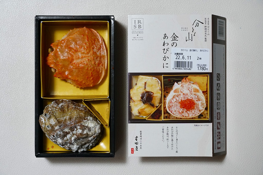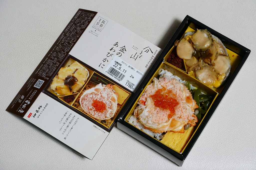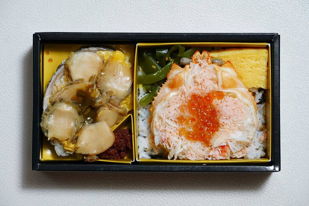 黒い紙箱をスリーブに収め、その絵柄を中身の写真とする姿は、近年の八戸駅の駅弁屋の新作に共通する。中身はワカメ御飯にカニ殻と茎わかめと玉子焼を載せ、カニ殻の中に酢飯を詰めてカニほぐし身とイクラで覆うものと、アワビの貝殻に茶飯を詰めてアワビと肝ソースと玉子を盛りウニ佃煮を添えるもの。