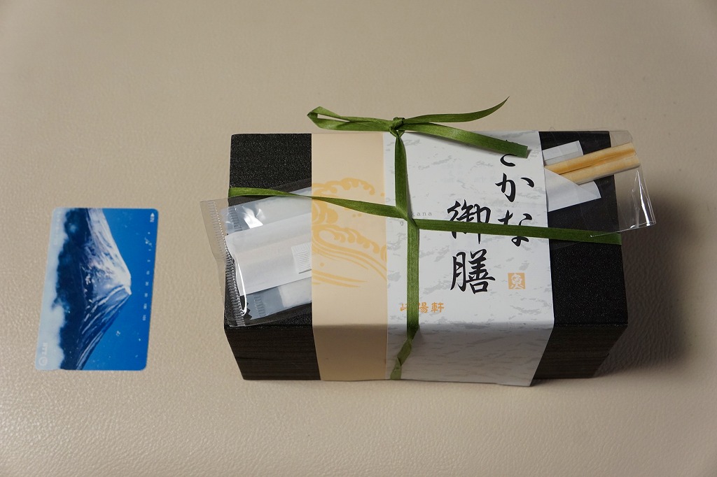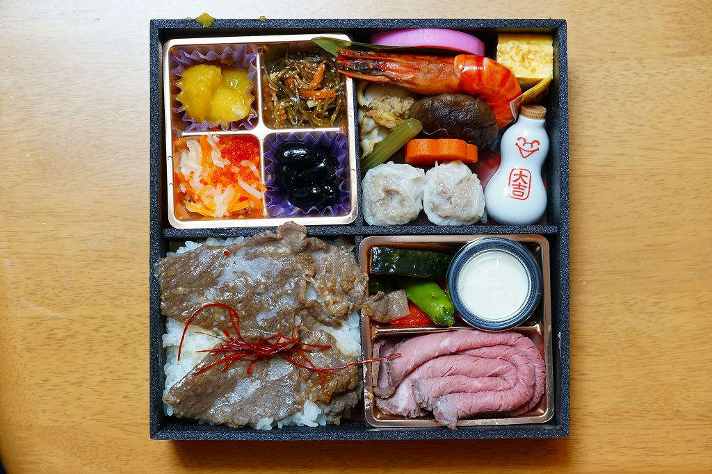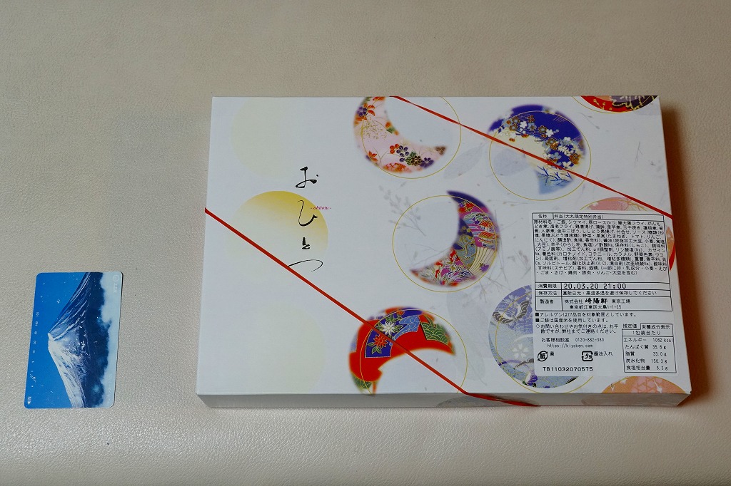 上記の弁当「特別弁当」と同じく、「膳まい」限定販売弁当と思われる。大きく柔らかい木目調の容器を、和紙風の風呂敷で包む。中身は日の丸御飯に牛肉しぐれ煮、アンコウ唐揚げにカニとイカの酢の物、有頭海老に里芋田楽やカボチャその他の煮物、鮭昆布書に特製シウマイ1個、ゆず大福など。