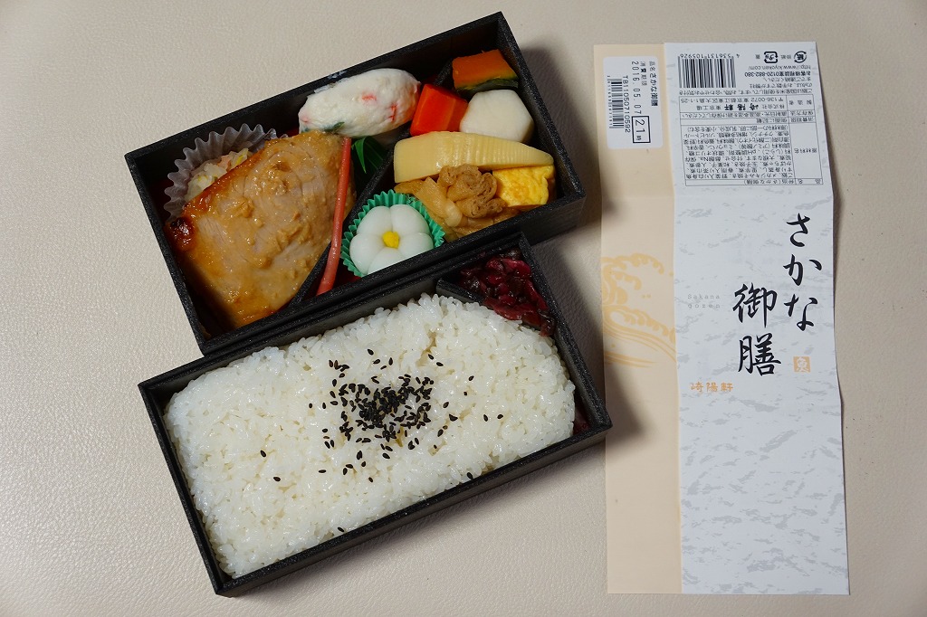 2016(平成28)年3月18日に東京地区と神奈川地区で発売。真っ黒な二段重ねの容器の下段は白御飯と柴漬け、上段は大きなメカジキ麹味噌焼に、タケノコやサトイモなどの煮物、生姜白さつま、大根なます、白梅なる甘味など。駅でも売られるでパ地下タイプの高級弁当。2011年発売の「おべんとう魚」と同じく、崎陽軒の弁当なのにシウマイが入らないが、これは話題にはされなかった。2017年までの販売か。