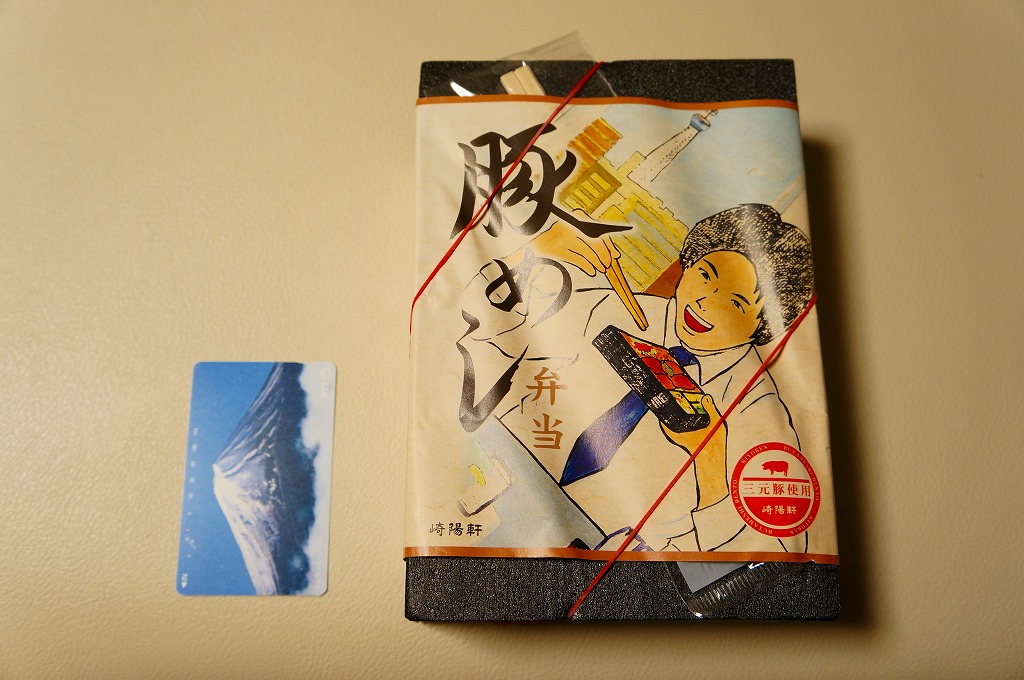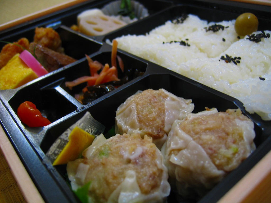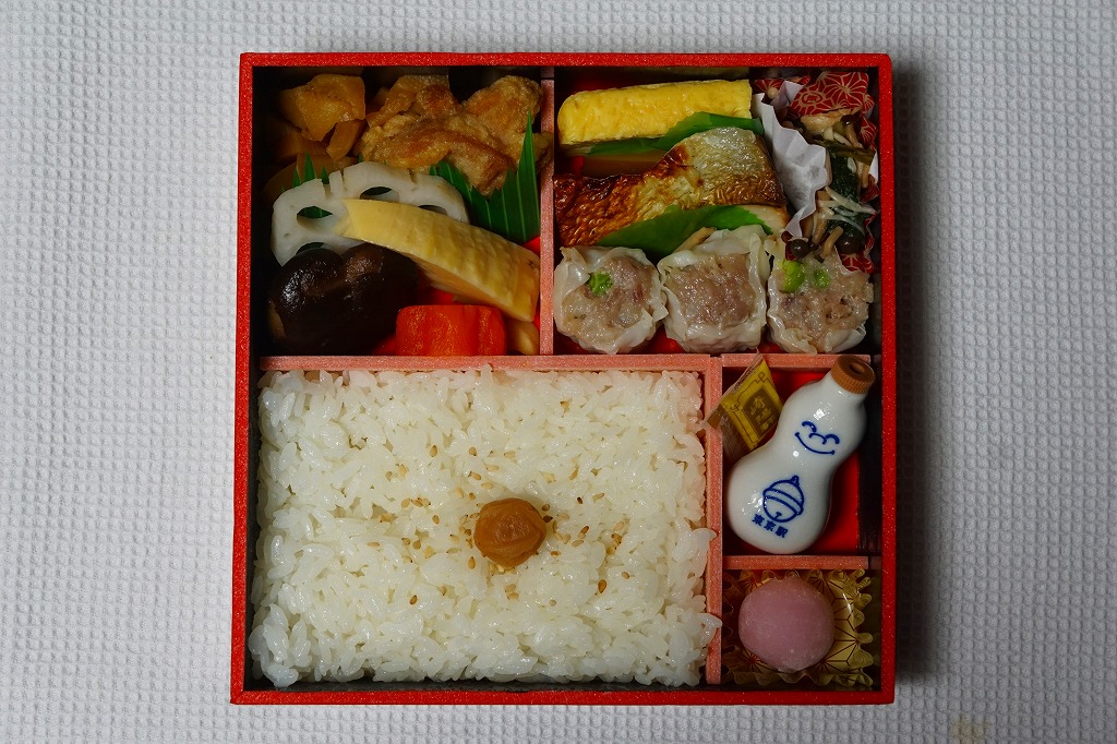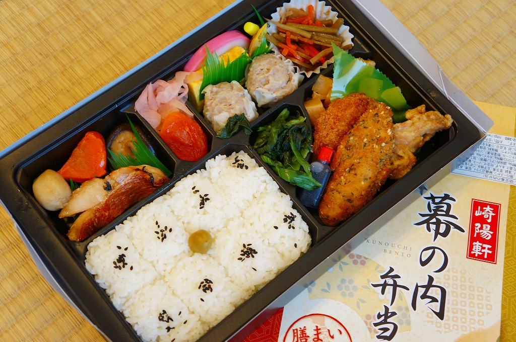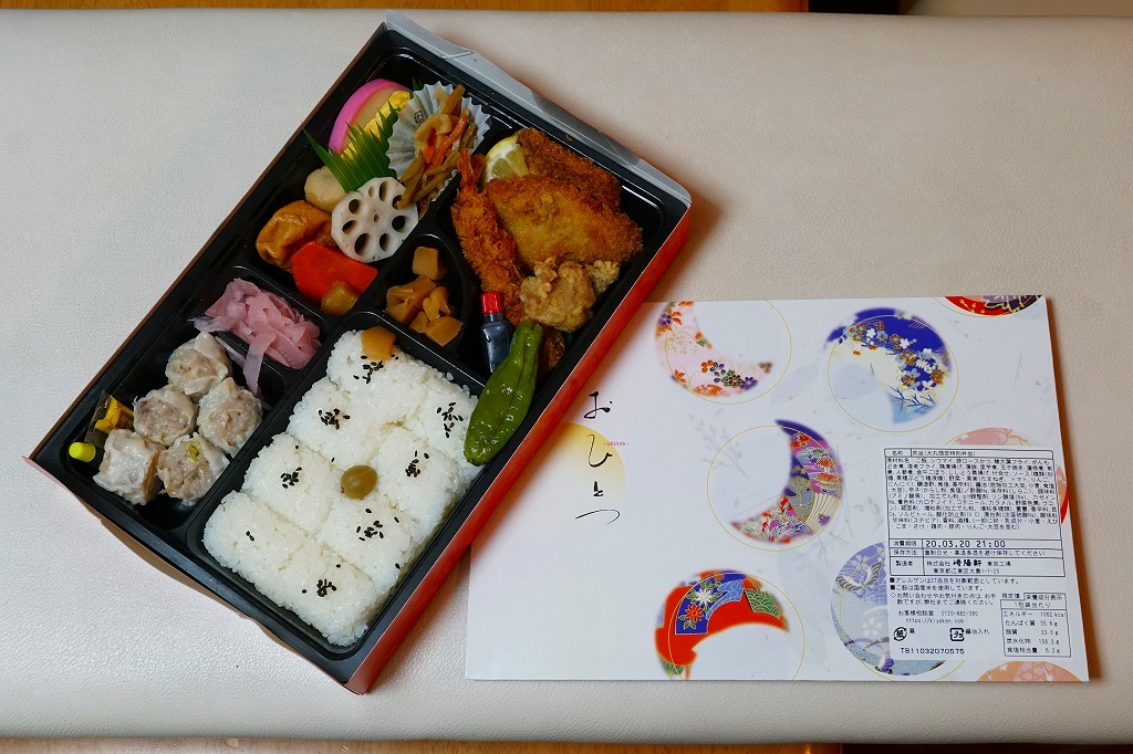 大丸東京店のデパ地下で買えたお弁当。横浜や東京にたくさんある崎陽軒の店舗でも、ここでしか買えないものと思われる。市販の仕出し弁当向け容器をそのまま使う。日の丸俵飯、トンカツとマグロフライとエビフライと鶏唐揚、かまぼこと玉子焼、ニンジンとレンコンの煮物、タケノコ煮、きんぴらごぼう、大根桜漬、シウマイ5個という中身は、横浜駅弁「シウマイ弁当」の上等版に見える、崎陽軒ファンにはうれしい構成。