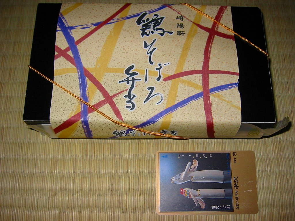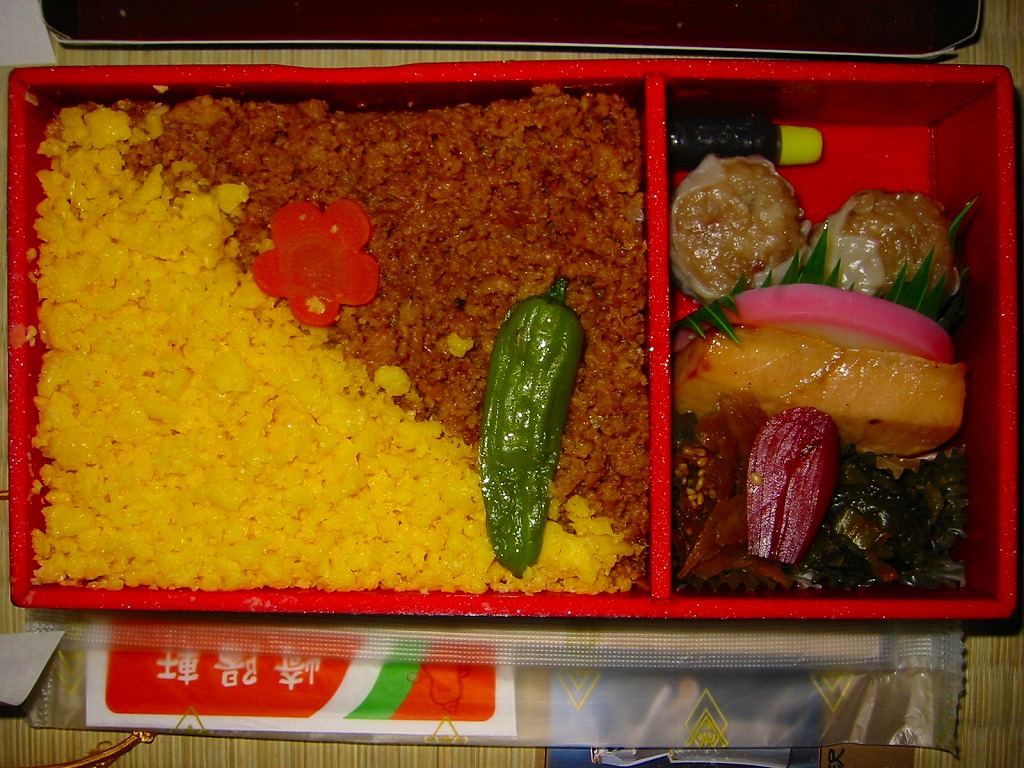 横浜では販売されていない崎陽軒東京工場のお弁当で、これは品川駅ビル食品売場内崎陽軒ブースで購入。真っ黒で木目の浮き出た重厚な長方形の容器に和風な凹凸のある掛紙をかけて金色の輪ゴムでしばる。中身は鶏そぼろと玉子そぼろが乗ったちょっと甘辛な鶏御飯に、カジキマグロ照焼や蒲鉾とシウマイ2個を添えるもの。どう見ても横浜駅弁にしか見えないのだが、やっぱり横浜駅弁でない。2010年頃までの販売か。