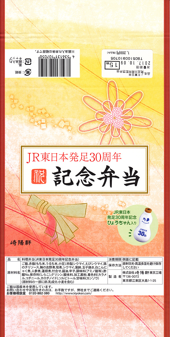 駅弁の名前のとおり、JR東日本の発足30周年を記念し、JR東日本リテールネットと崎陽軒が、2017(平成29)年10月1日から翌年1月8日までの土休日に販売。崎陽軒の駅弁売店でなく、「膳まい」などJR東日本リテールネットの駅弁売店で売られた。