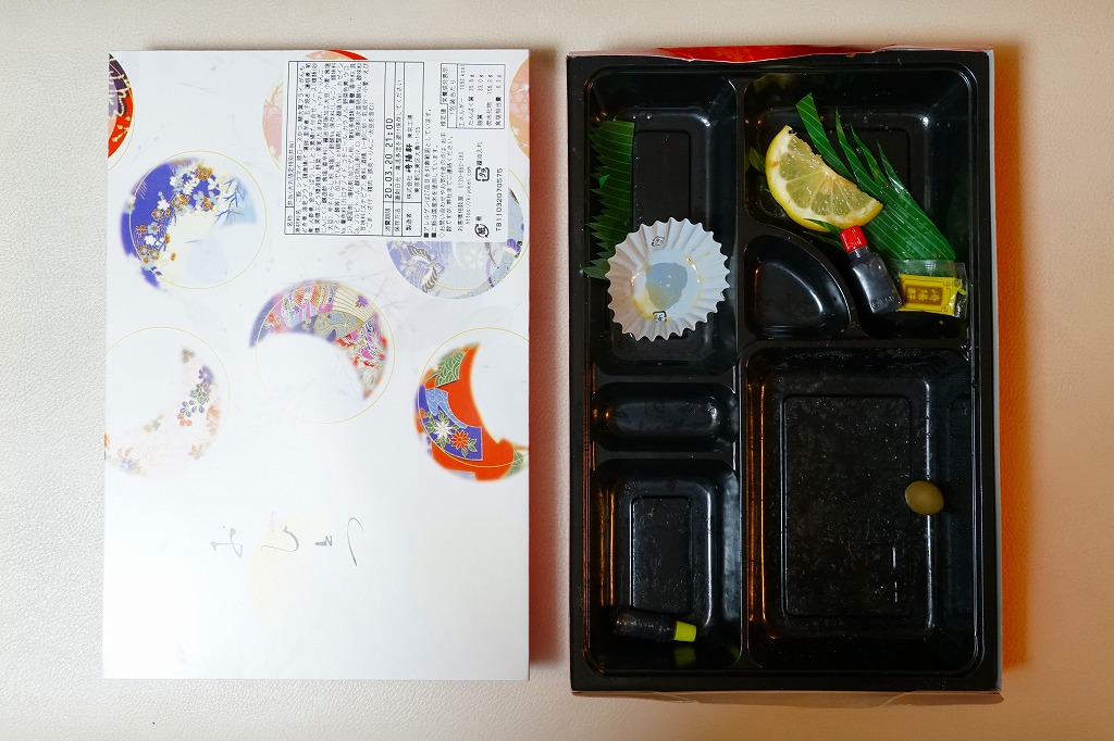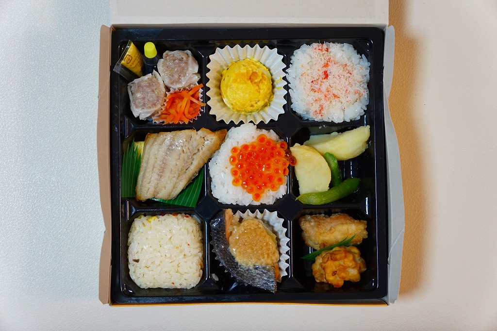 市販の惣菜弁当容器に収まる9区画の中身は、おしながきのとおり、魚ピラフ、イクラ御飯、カニ御飯、じゃがいもとアスパラ、鶏唐揚とトウモロコシ揚、鮭チャンチャン焼、かぼちゃサラダ、ホッケ塩焼きと玉子焼、キャロットサラダ、シウマイ2個と、北海道を思わせる食材が多用されていた。1か月間ほどの販売か