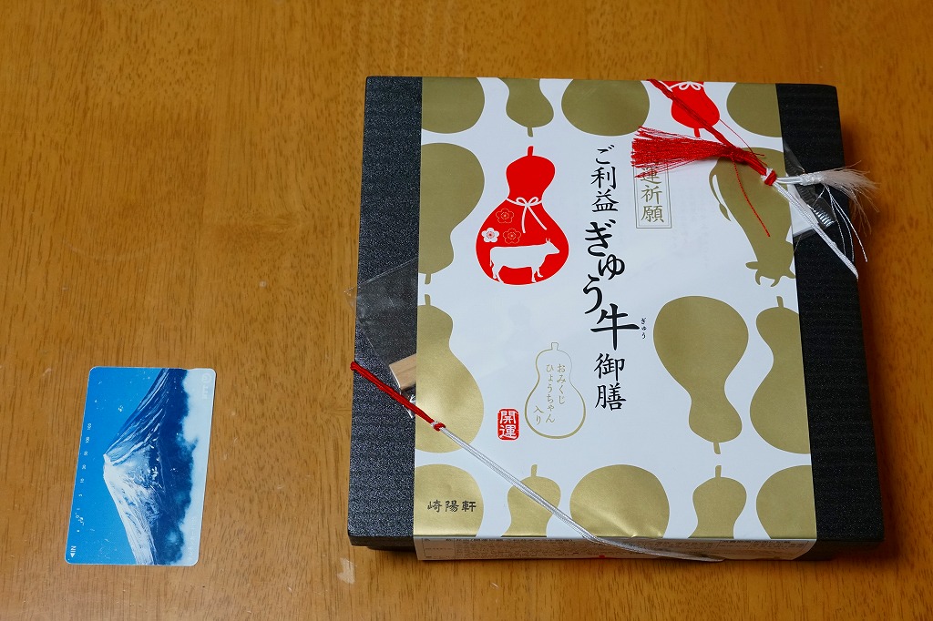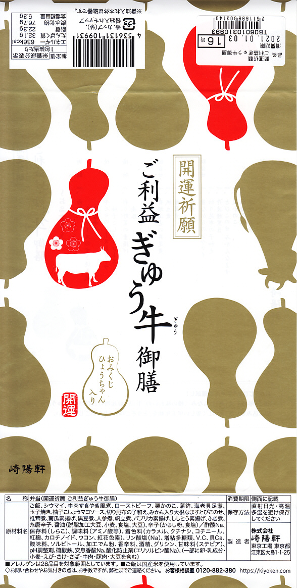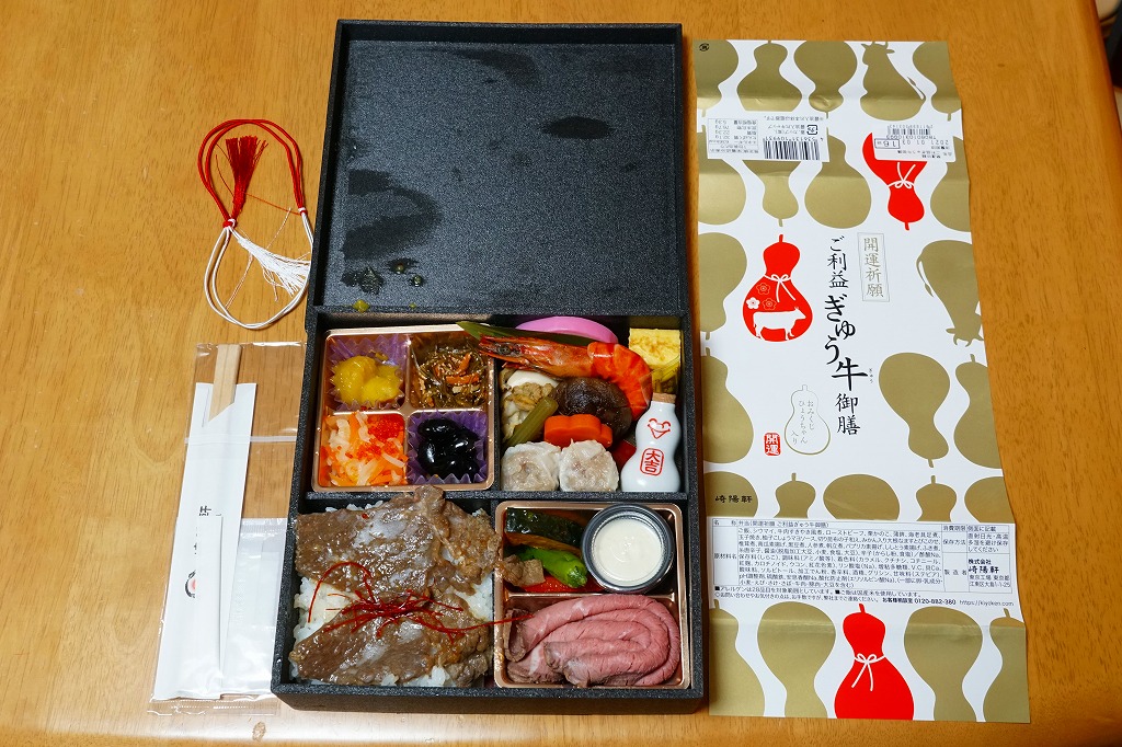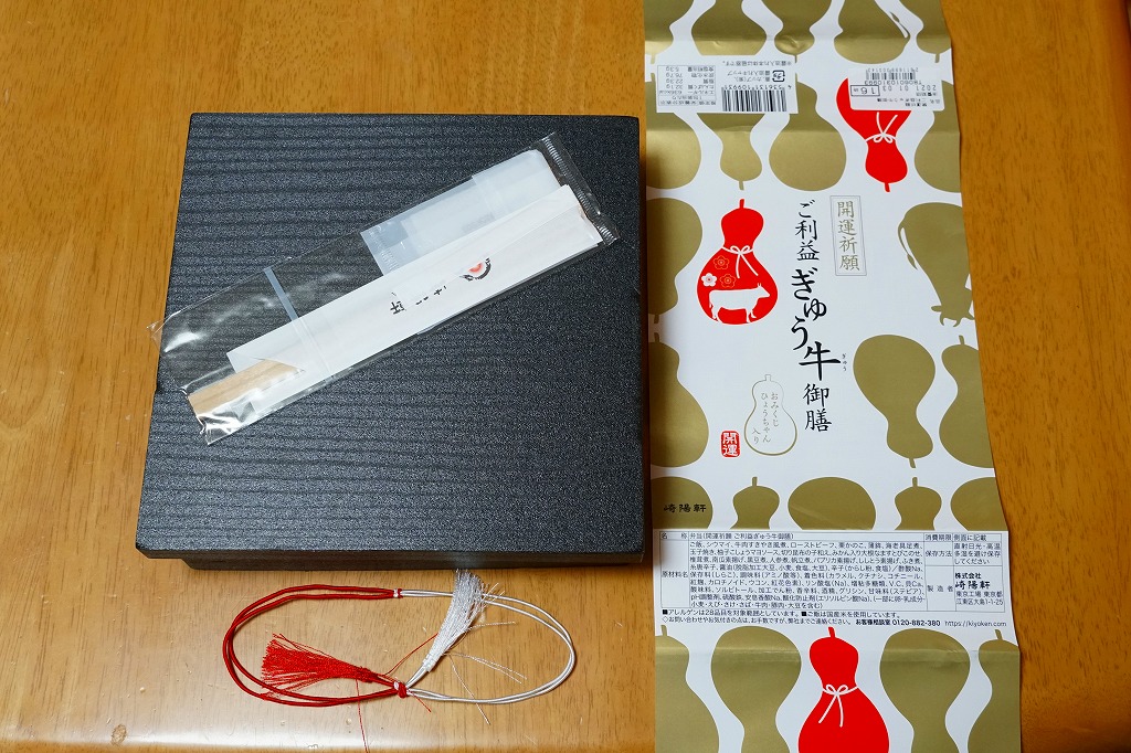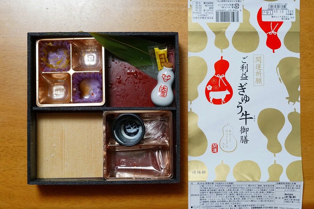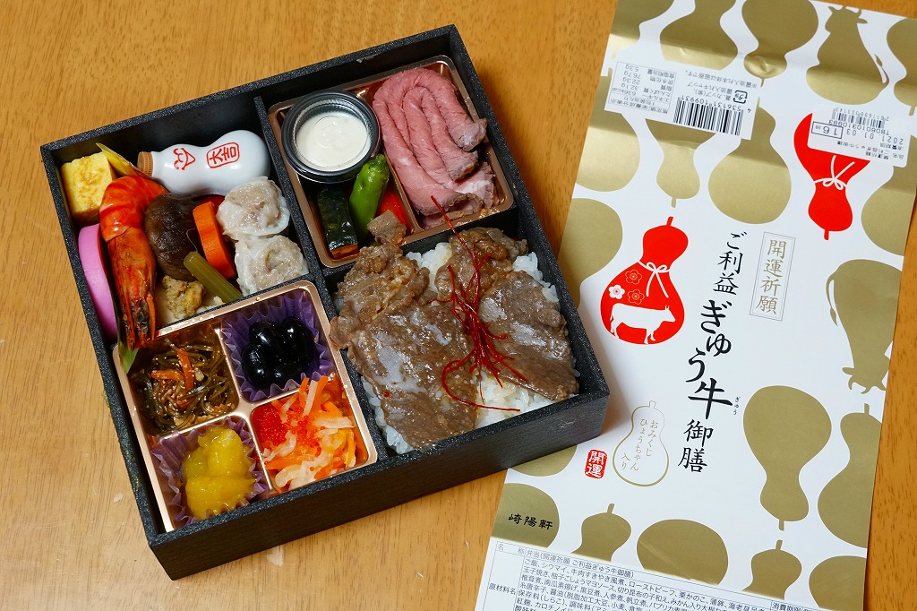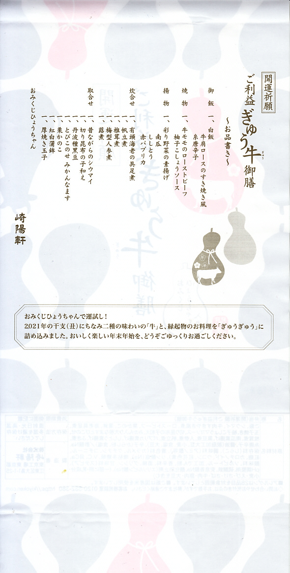 おせち料理とおみくじを併せ持ったような商品。掛紙は磁器の醤油入れ「ひょうちゃん」のシルエットでできている。中身は松花堂弁当のように4分割され、白飯と牛肉、野菜の素揚げとローストビーフと柚子こしょうソース、黒豆と栗かのこと切昆布和えとエビチリ、ホタテや有頭海老などの煮物と蒲鉾と玉子焼とシウマイ2個。磁器の醤油入れ「ひょうちゃん」は、この弁当の限定品で、「大吉」「中吉」「吉」のいずれかが入った。