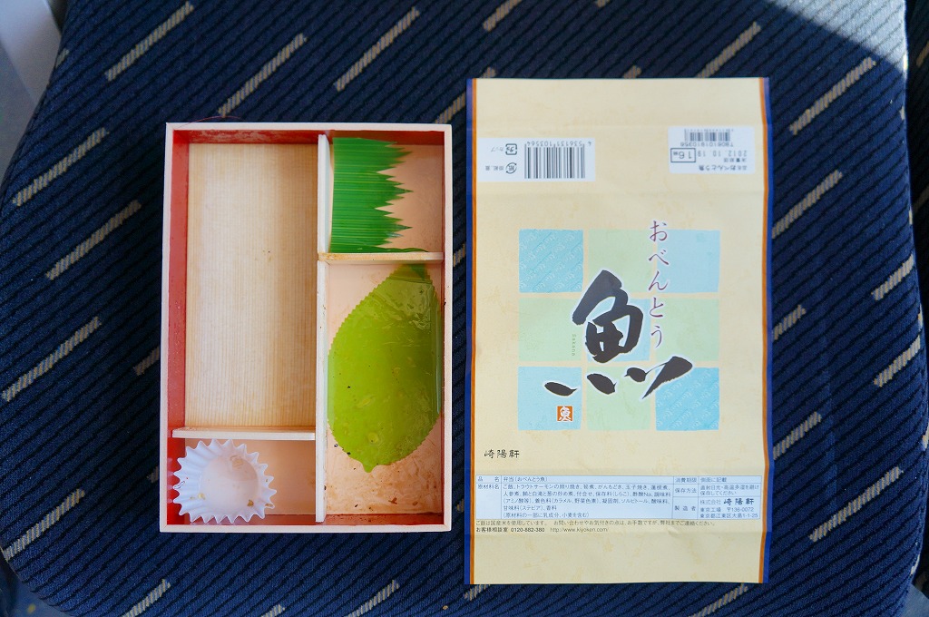 商品名をシンプルにデザインした掛紙に包まれる長方形の折り箱には、胡麻ふり白御飯、トラウトサーモンの風味照焼、まぐろフレーク、玉子焼、ニンジンやレンコンなどの煮物、タケノコ煮、大根桜漬など。かつての上野駅弁「上野弁当」を上回る感じの大きな大きな焼サーモンが大きな存在感。たしかに御飯の具合を除き、崎陽軒らしさが入っていないような感じを受けた。2014年頃まで販売か。