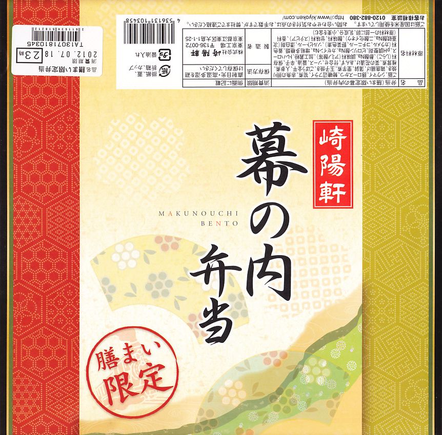 東京都内の駅弁売店「膳まい」でのみ販売されている、崎陽軒東京工場の幕の内弁当で、下記の商品「特別弁当」を2011年または2012年にリニューアルか。掛紙の意匠や商品名が変わったり、容器が発泡材からボール紙製に変わったが、価格やおおまかな内容は変わらない。日の丸俵飯にロースカツ、アジフライ、赤魚照焼、鶏唐揚、シイタケやサトイモなどの煮物、きんぴらごぼう、かまぼこと玉子焼、タケノコ煮、シウマイ2個など。