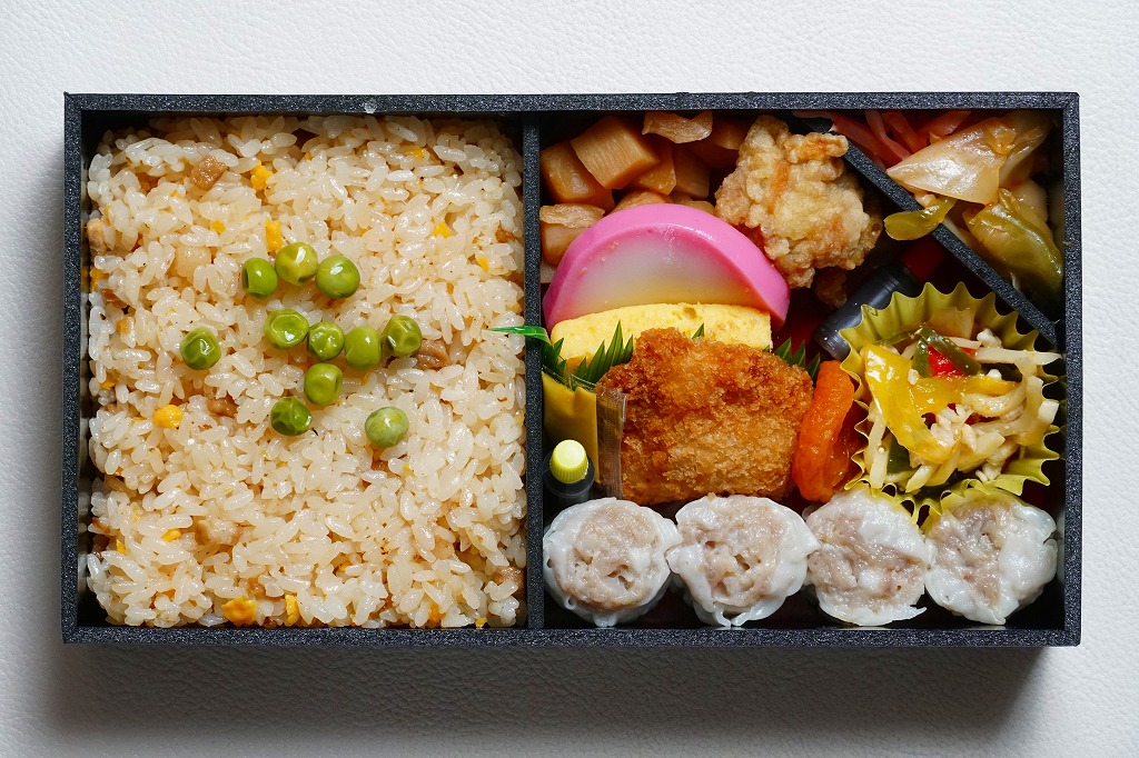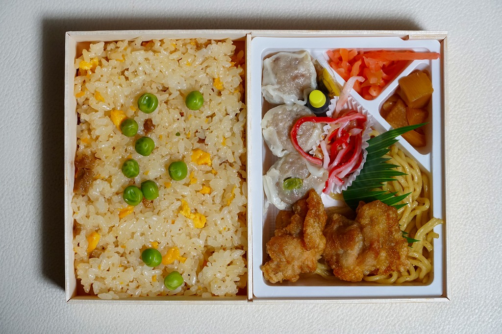 シウマイ弁当サイズの長方形容器に、直にチャーハンを詰め、白いプラ製トレーに鶏唐揚、塩焼きそば、カマボコとクラゲと錦糸卵の酢の物、タケノコ煮、シウマイ3個、紅生姜を詰める。冷蔵でなく常温で売られる、冷めた炒飯弁当。それでも塩気がきつめの炒飯にはパラパラ感があり、一方で「横濱チャーハン」のようにスプーンを添付せず、割りばしでいただける。