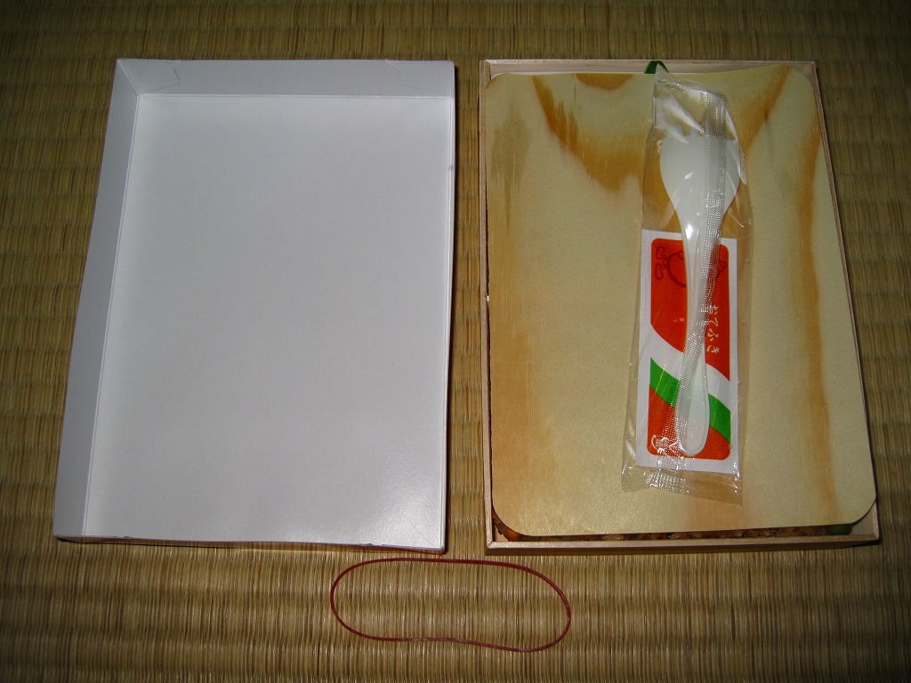 2010(平成22)年3月16日に購入した、東京駅弁のふた。2010年の発売時から2014年頃まで炒飯弁当は、厚紙でなく経木のふたをして、掛紙でなく厚紙のふたをしていた。容器の本体は経木折でないが、この部分は東京工場版シウマイ弁当と同じつくり。中身は上記の2024年のものと変わらない。