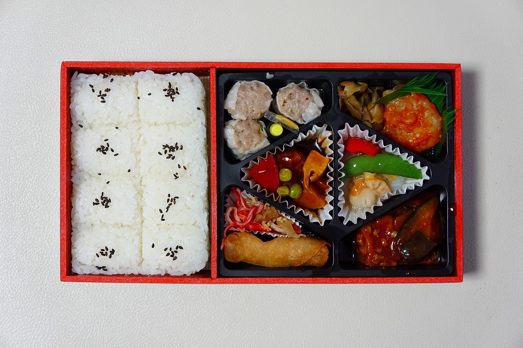 外は黒く中は赤い長方形の容器にビニールをかけて割り箸を載せて、商品名と中華らしいような絵柄を描いた紙ぶたをする。中身は俵型風白御飯に春巻、エビチリ、海老餃子、酢豚、ザーサイ、棒々鶏(バンバンジー)などの中華おかずとシウマイ。