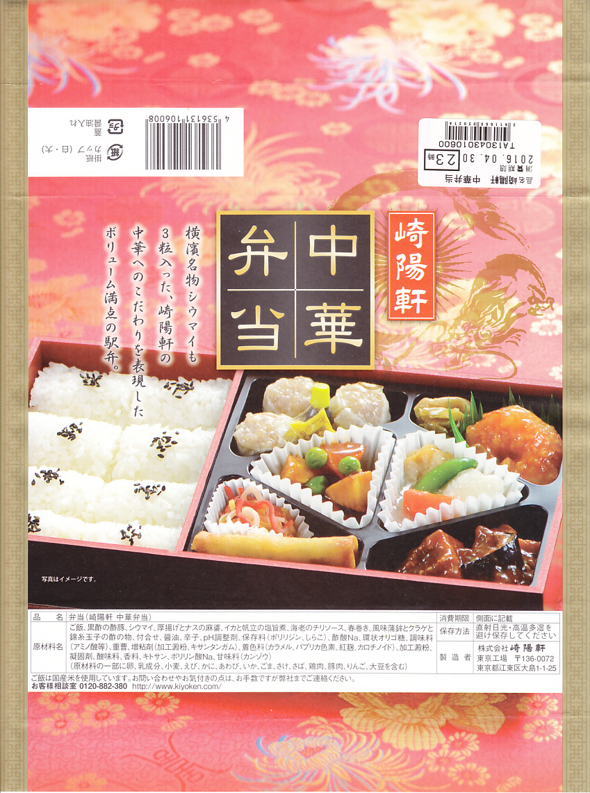 これは5年前に買った下記の駅弁「中華弁当」の現況、と言いたいところだが、普段の東京駅ではNREの駅弁売店で崎陽軒の弁当は買えず、リテールネットの「膳まい」ではシウマイ弁当のみを取り扱うため、この弁当は駅弁ではなくデパ地下弁当だと思う。崎陽軒東京工場製の弁当として、都内のデパ地下の崎陽軒売店ではいつでも買える。