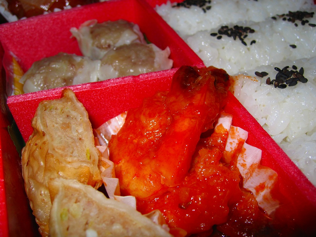 2011(平成23)年3月5・6日に東京駅で開催された第13回東日本縦断駅弁大会で購入できた崎陽軒のお弁当。赤い素材を黒く塗った長方形の容器に、中国らしい絵柄である朱色のボール紙でふたをする。中身は俵型御飯に酢豚、エビチリ、油琳鶏(ユーリンチー)なる鶏肉、イカ煮、春巻、塩焼そば、山クラゲ、ザーサイ、シウマイ3個。同じ調製元とコンセプトの「横濱中華弁当」より、おかずの見栄えも味もこぢんまりしているような。