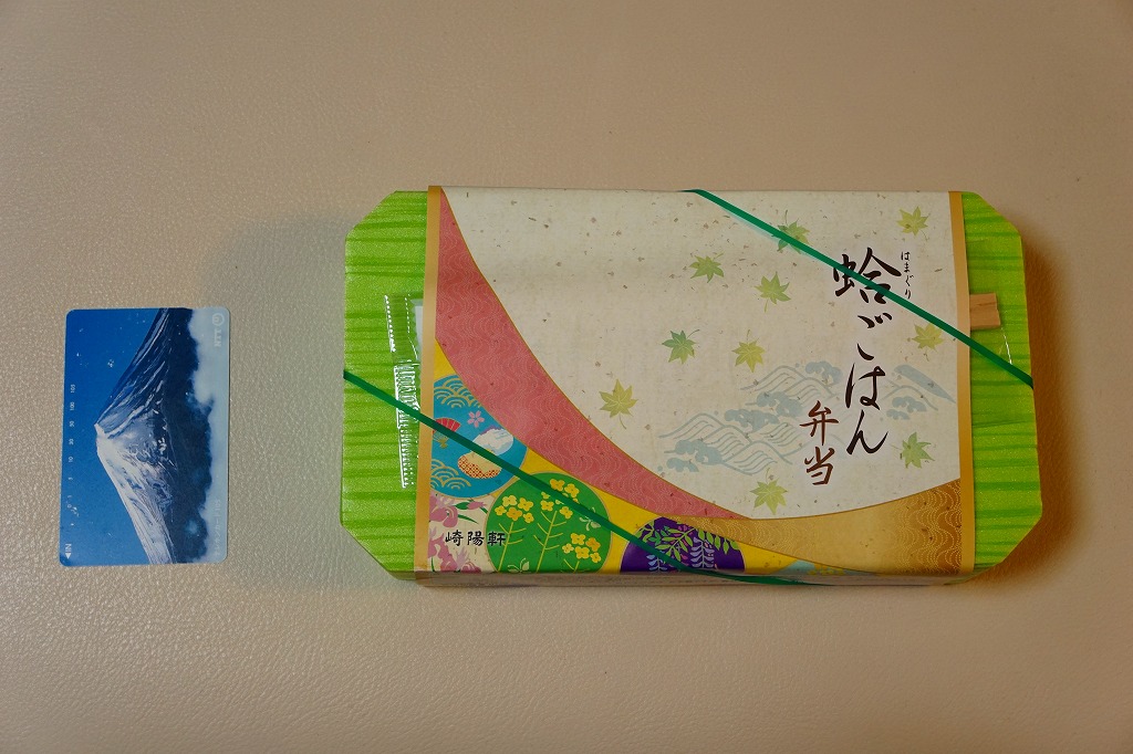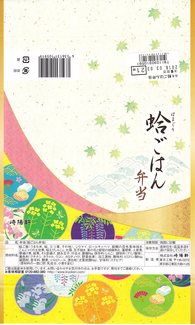 2016(平成28)年3月1日から5月8日まで、東京地区と一部横浜地区で販売。ちょっと贅沢なひとときを楽しむ「旬彩弁当シリーズ」の、下記「蟹ごはん弁当」に続く第3弾。蛍光グリーンの弁当箱に、和風でもコンセプトが読み取れない絵柄の掛紙を巻く。