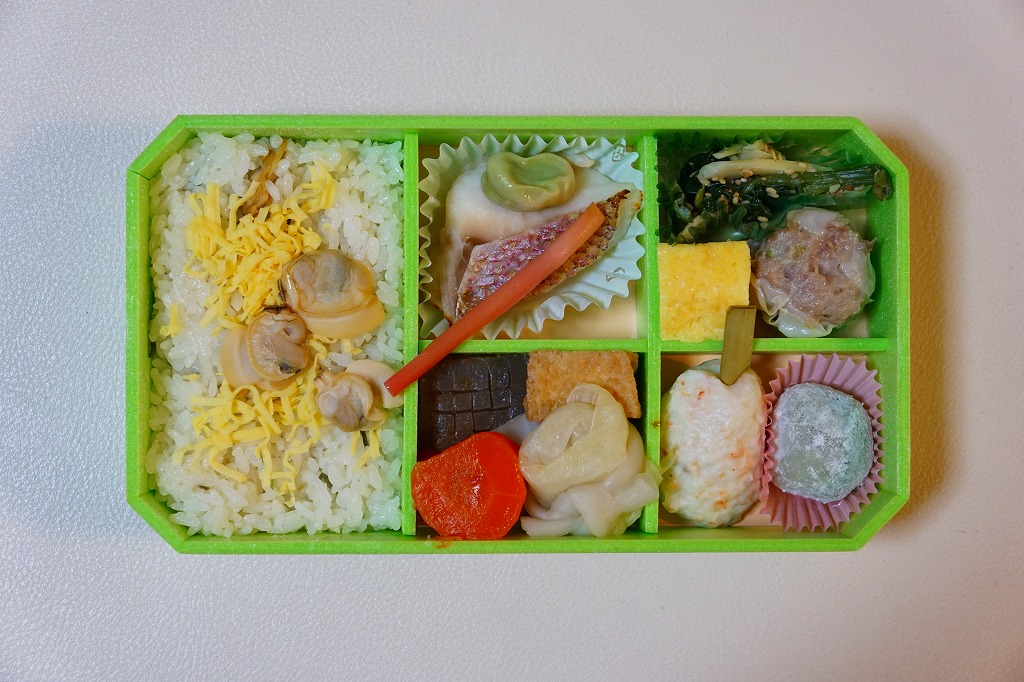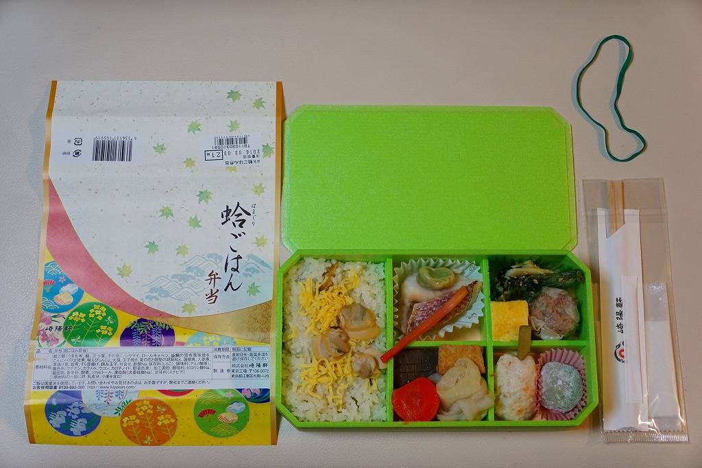 中身はハマグリ御飯、厚焼き玉子、サクラエビしんじょう、菜の花と姫筍の和え物、ヒメダイ塩焼き、ロールキャベツやニンジンなどの煮物、ソラマメ揚げ、よもぎ大福、特製シウマイ1個など。ハマグリは確かに入っているものの、ハマグリの存在感がほとんどない、淡く爽やかな味のお弁当。