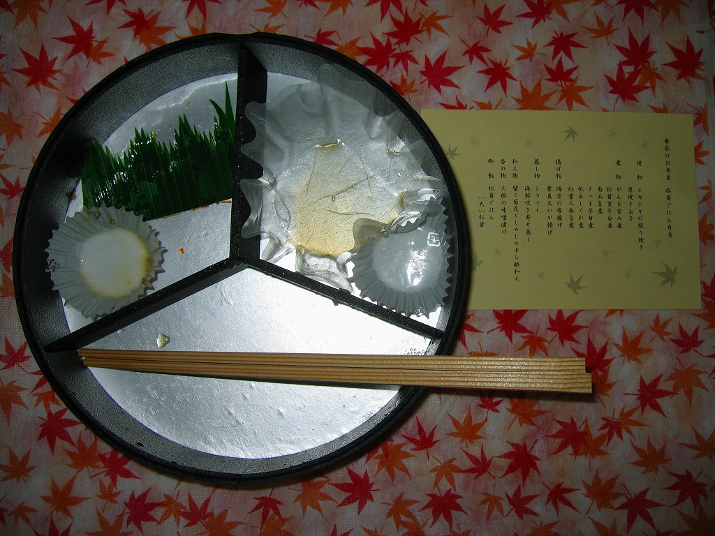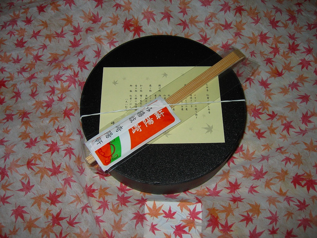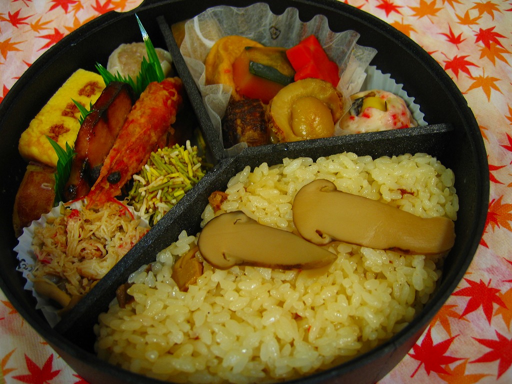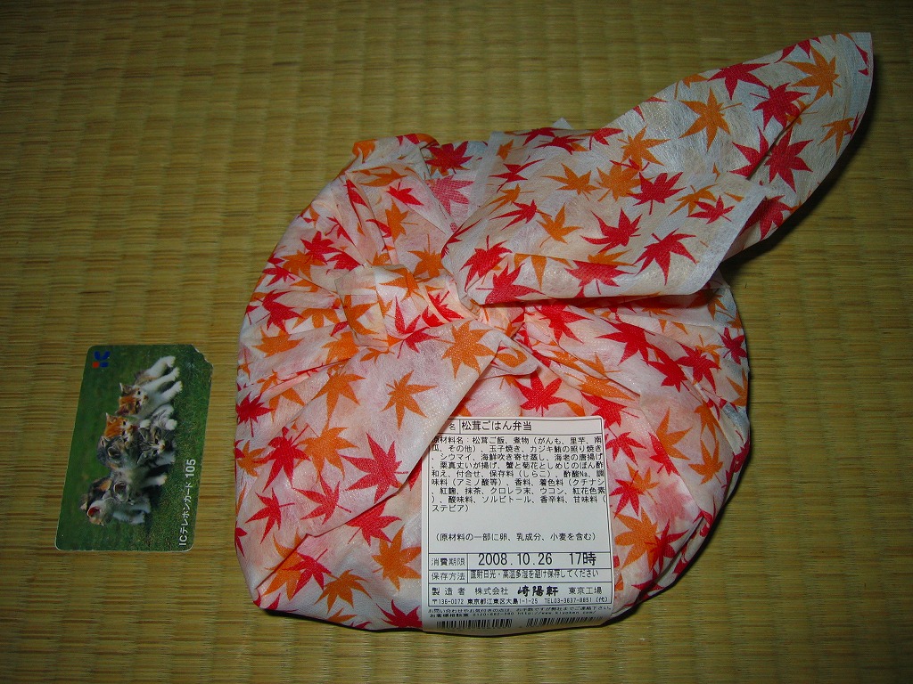 2008(平成20)年9月20日から11月30日まで東京地区で販売された崎陽軒の秋弁当。黒い円形の容器を、紅葉がいっぱいの風呂敷で包む。中身はベンツのマークのように3分割され、松茸御飯、ホタテやカボチャやニンジンなどの煮物、揚げ海老にメメカジキ照焼に厚焼き玉子に魚すり身団子やシウマイなど。デパ地下弁当の雰囲気いっぱいで、実際に都内のデパ地下でも買える。横浜エリアでの販売はなかった。