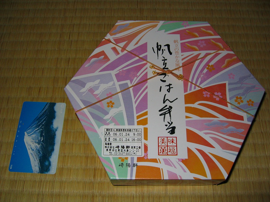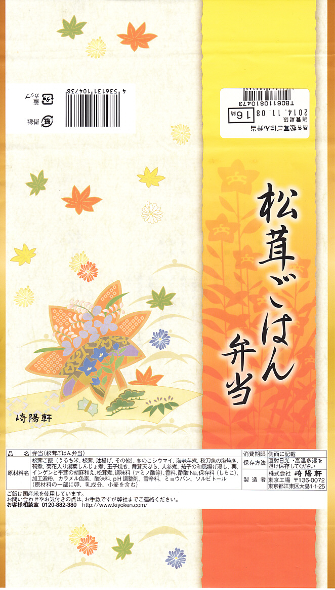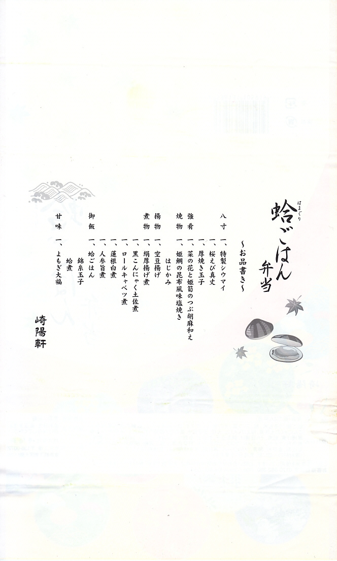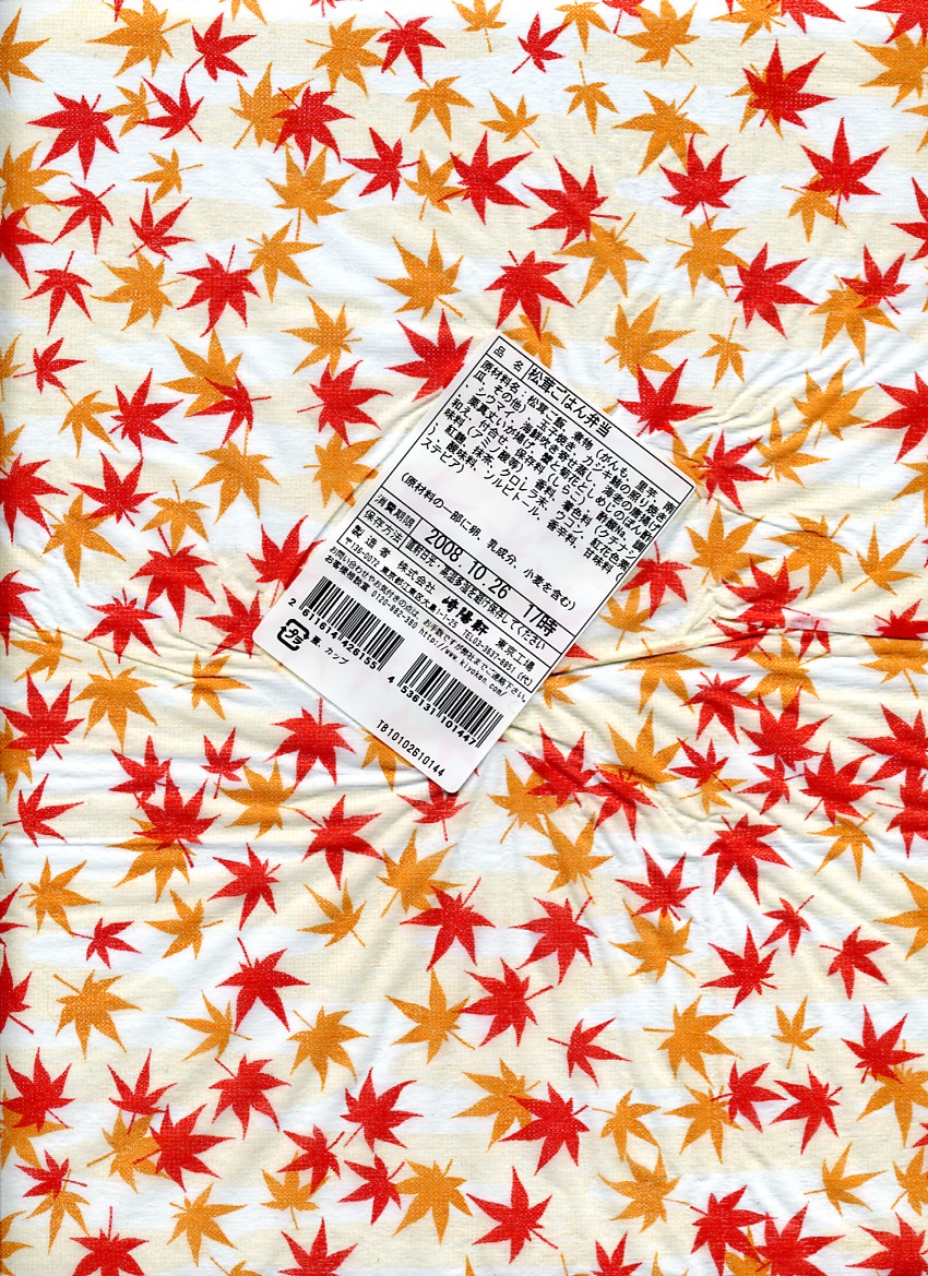 2008(平成20)年9月20日から11月30日まで東京地区で販売された崎陽軒の秋弁当。黒い円形の容器を、紅葉がいっぱいの風呂敷で包む。中身はベンツのマークのように3分割され、松茸御飯、ホタテやカボチャやニンジンなどの煮物、揚げ海老にメメカジキ照焼に厚焼き玉子に魚すり身団子やシウマイなど。デパ地下弁当の雰囲気いっぱいで、実際に都内のデパ地下でも買える。横浜エリアでの販売はなかった。